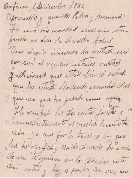 Totes les cartes les encapçala amb “salud”, i parla de manera molt afectuosa als pares i germans. També repeteix en tots els escrits que es troba bé de salut i molt feliç i integrat en la seva nova vida a Conca; alaba l’educació i protecció que ha rebut de la família, s’alegra de la bona marxa de les collites, sempre diu que no necessita res i recomana a José Mª que tinga cura dels de casa.