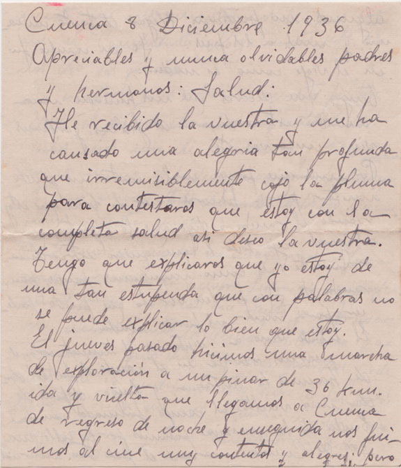 Dimarts 8 de desembre. El dia 8 envia dos cartes, que com és habitual encapçala amb un “salud”. Han fet una marxa de 36 quilòmetres i per la nit va al cine; molts altres no poden anar perquè els fan ma els peus, ell està molt bé. Reparteix el ranxo, per tant pot menjar el que vol. La seva secció la formen 40 soldats, el volen tots, està exempt de guàrdies, imaginàries i tot el pitjor.