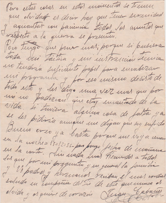 Con el fin que haga llegar a conocimiento de los padres o esposa del Sargento de este Batallón Juan Cabañes Ibáñez, tengo el sentimiento de participarle que en fecha diez de enero último y en ocasión de combate librado por la causa que tan legalmente defendemos, falleció a consecuencia de las heridas que recibiera.