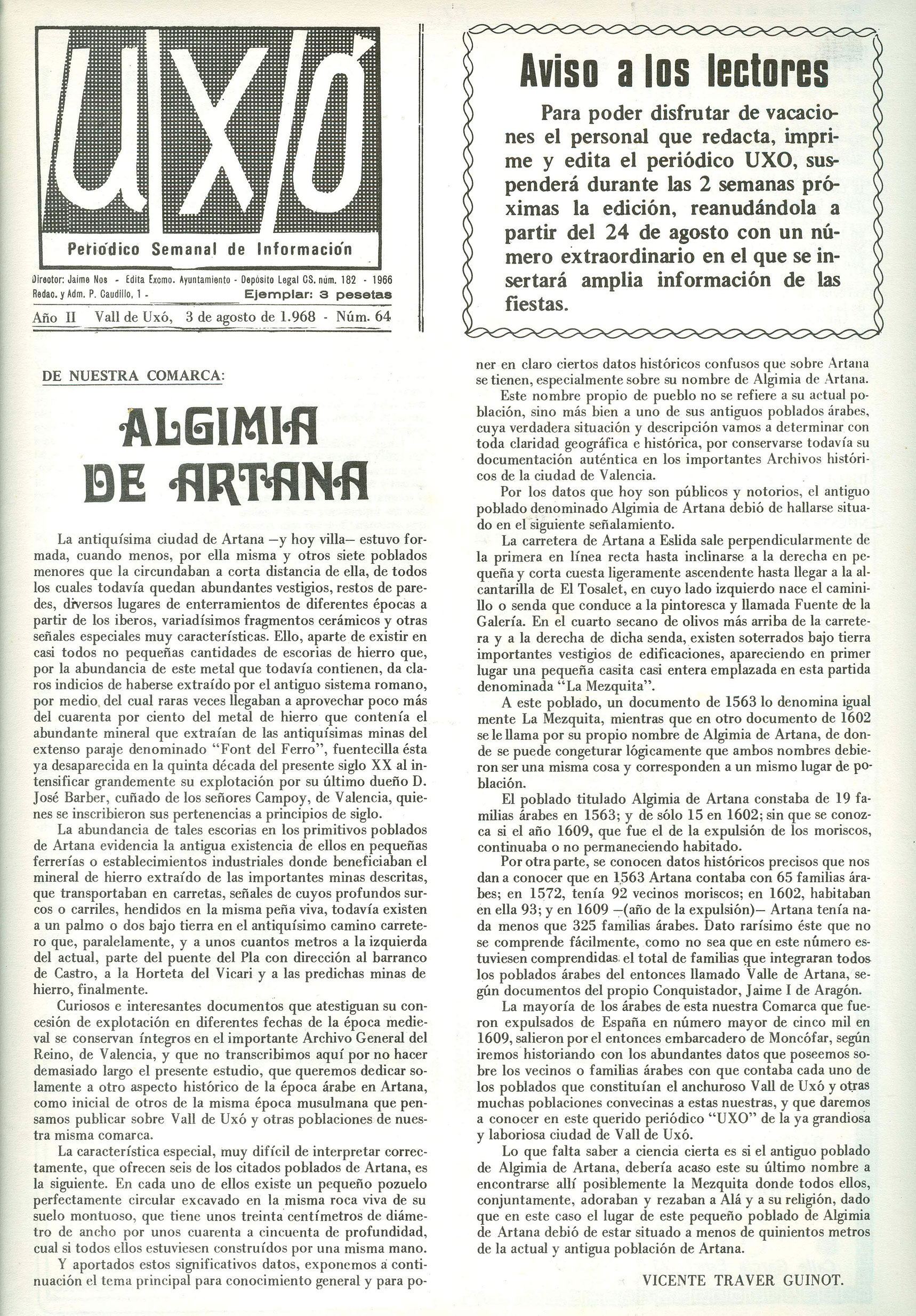 El company Juan Fuertes Palasi ens ha enviat un article del Periódico Semal de Informació UXÓ número 64, datat el 3 d’agost de 1968 i signat per Vicente Traver Guinot. Es tracta d’una informació històrica sobre l’Algímia d’Artana, un llogaret proper a l’actual població -a la partida de la Mesquita.