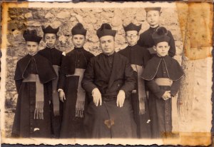 Una altra imatge de xiquets al Seminari de Tortosa, 1944 ó 45. D’esquerra a dreta, Vicente de l’Hostal, al que diuen que van expulsar per escriure’s amb la germana d’un altre seminarista; José i Juan Ramón Herrero Llidó ‘de Panxut’, l’adult Mn. Enrique Panxut (tio dels dos anteriors), José Herrero ‘Peneque’; José Sales ‘Tomeu’ i Enrique Silvestre. A l’últim el van enviar al seminari als 11 anys. Conten que era tan xiquet i rebaldia tant que el van tornar a casa. Anys després faria un altre intent exitós en un altre seminari. El Padre Enrique ha passat la vida en missions a Sud-Amèrica. També es conta d’un altre xiquet que, cansat del seminari, va escriure secretament una carta demanant que anaren a per ell i la va amagar dins d’uns calcetins bruts per a que la trobara sa mare quan li arribara la roba per a llavar.