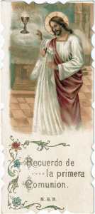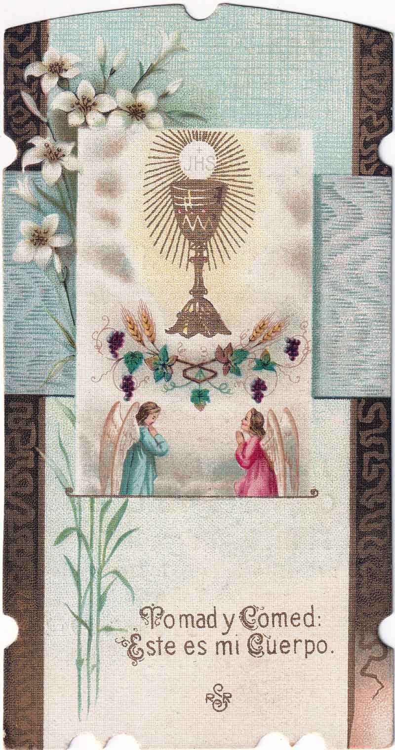 Record de la primera comunió de María Catret Silvestre, celebrada sorprenentment el dimarts 16 de maig de 1922 (?). En aquelles primeres dècades del segle XX (ho hem vist ja en la primera estampeta d’esta col·lecció) s’estilaven els formats estrets, amb vores mixtilínies, i els gravats en color i molta ornamentació.