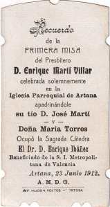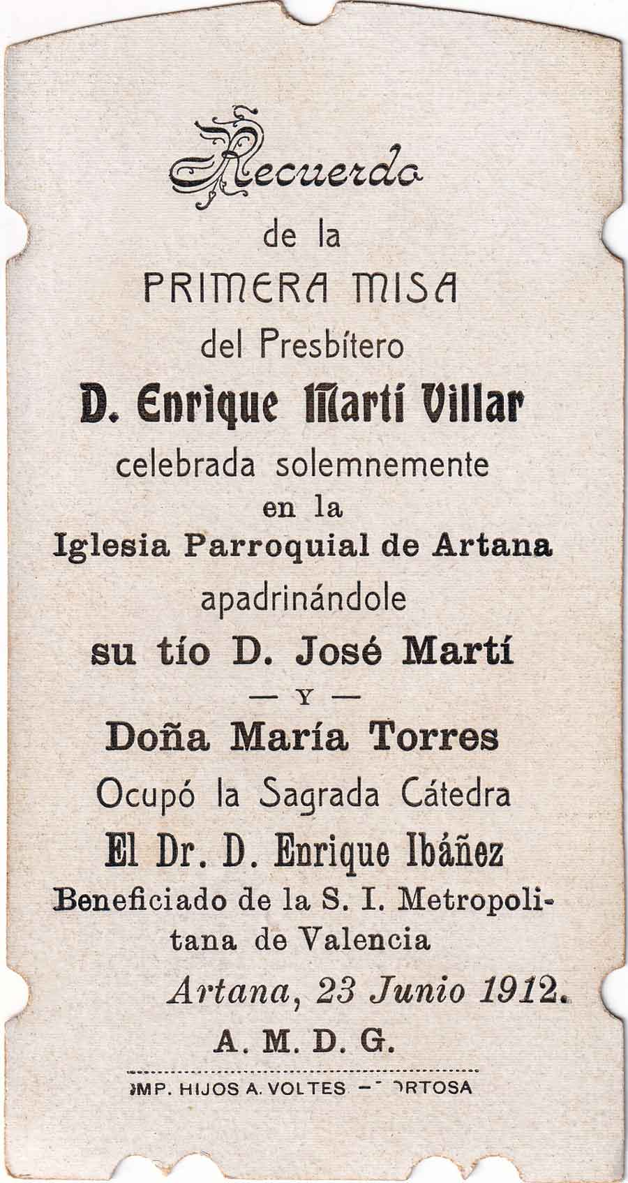 Record de la consagració sacerdotal d’Enrique Martí Villar (1886-1936). Diumenge 23 de juny de 1912. Sabem per Mn. Lluís Vilar Pla [Historia de Artana, p. 190] que una setmana després de cantar missa, Mn. Enrique va presidir la litúrgia en honor a Sant Lluís Gonçaga, en la celebració de les bodes de plata de la fundació dels Congregantes de María Ynmaculada y S. Luis Gonzaga, per les quals es van fer grans festes.