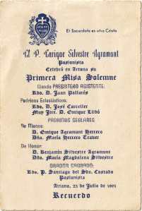 Dos impresos distints per l’ordenació sacerdotal d’Enrique Silvestre Agramunt, el Padre Enrique del C. de Jesús (Passionista), el diumenge 23 de juliol de 1961. El primer, que podeu obrir en PDF, és un targetó de quatre planes.