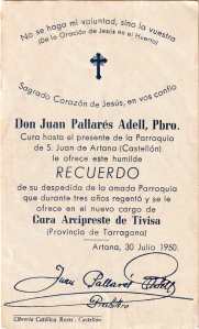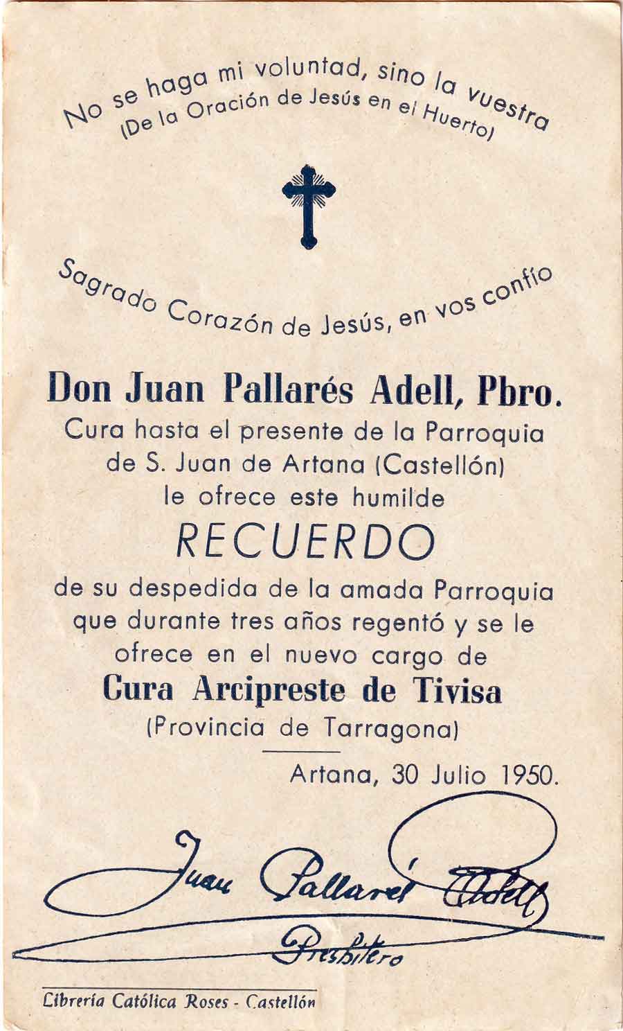 Despedida d’Artana del retor Juan Pallarés Adell. Diumenge 30 de juliol de 1950.