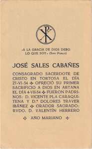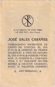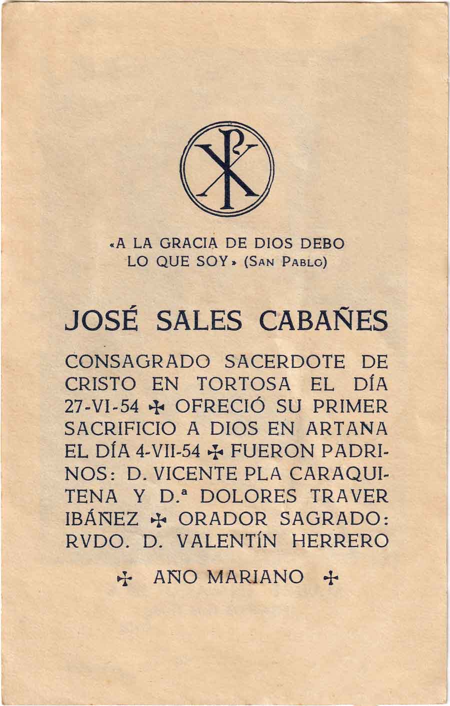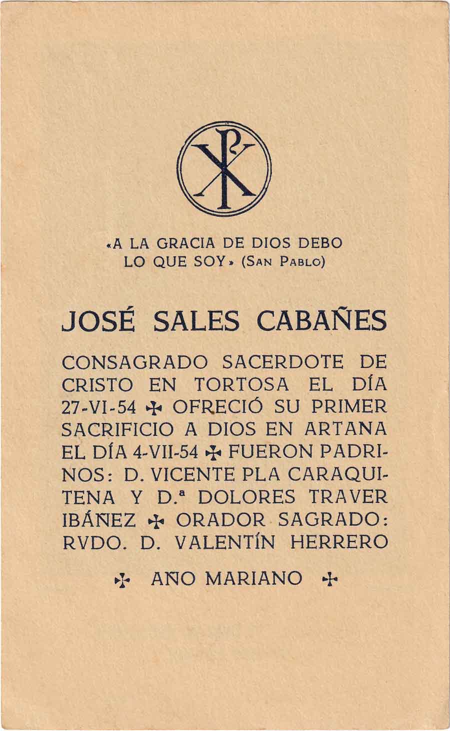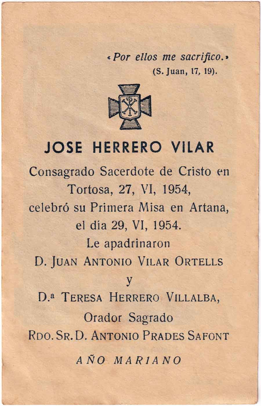 Record de la consagració sacerdotal de José Herrero Vilar (Mn. Peneque). Tortosa diumenge 27-VI-1954, Artana dimarts 29-VI-1954.