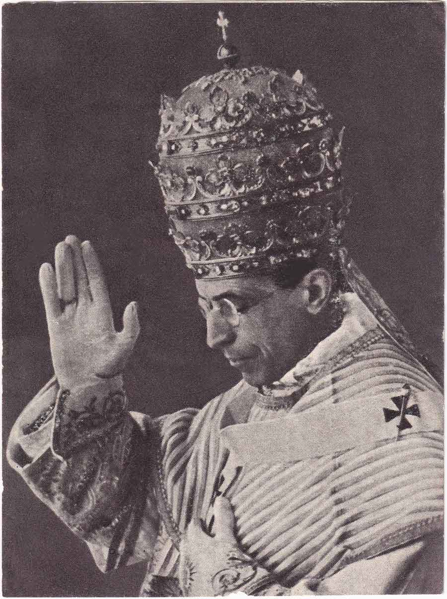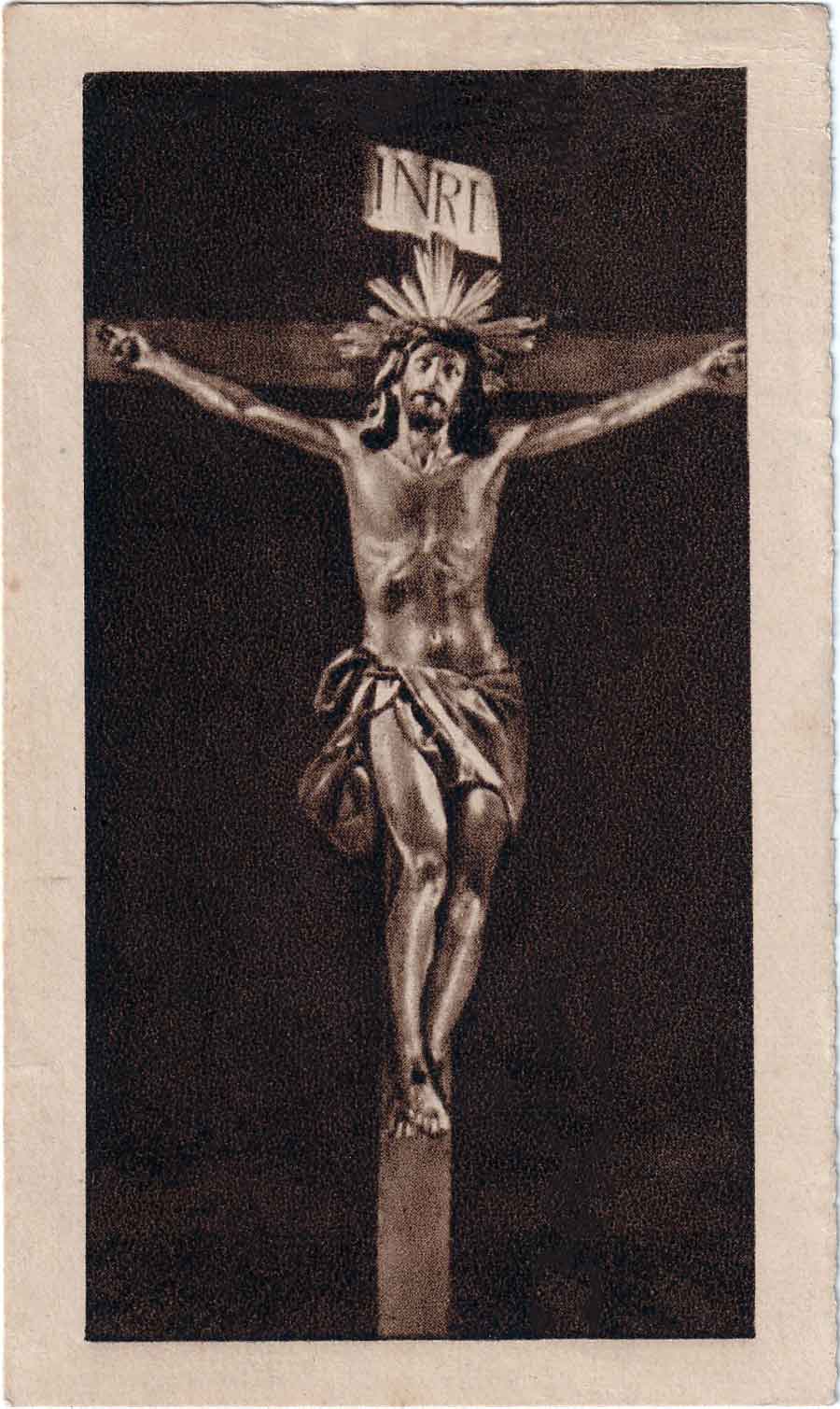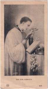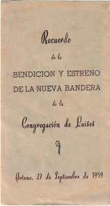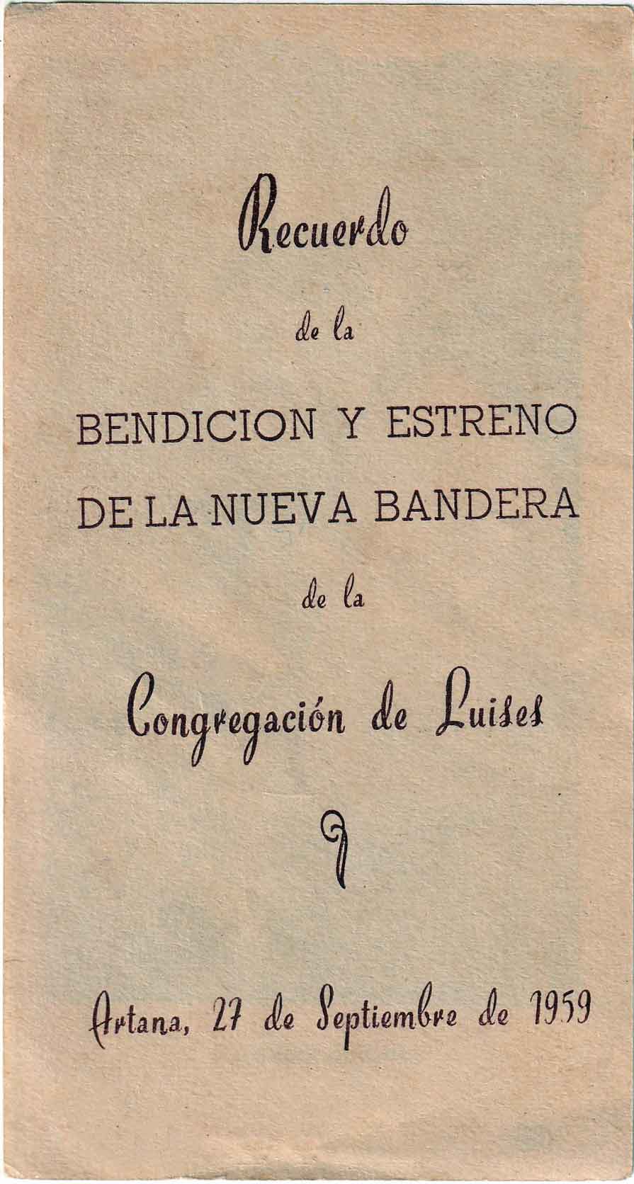 Record de la benedicció de la nova bandera de la Congregació dels Lluïsos. Diumenge 27 de setembre de 1959. La imatge és la canónica de Sant Lluís, amb hàbit jesuïta, mirant un crucifix que sosté a la mà, i lliri i calavera.