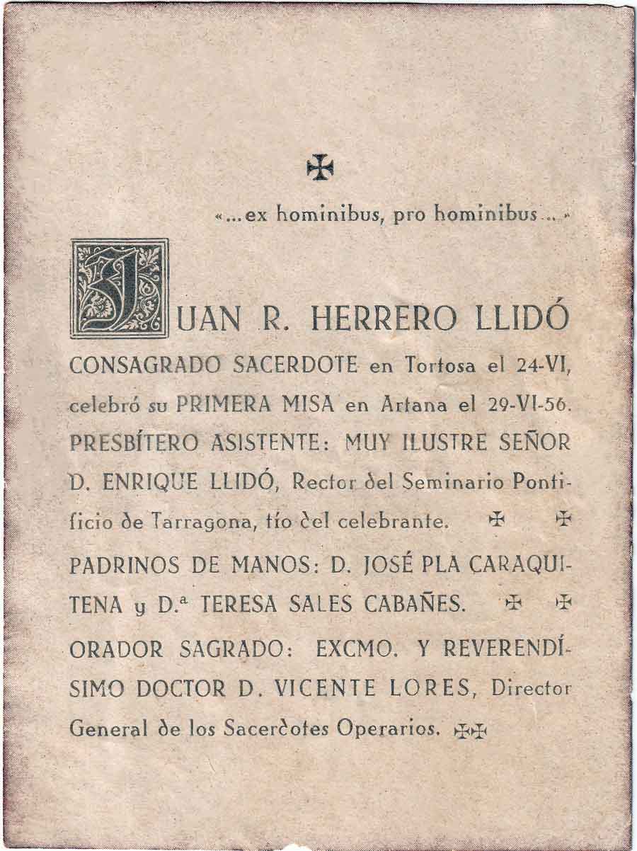 Record de la consagració sacerdotal de Juan R. Herrero Llidó (Juan Ramón de Panxut). Tortosa diumenge 24-VI-1956, Artana divendres 29-VI-1956.