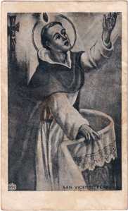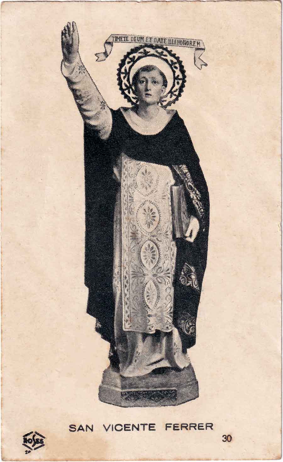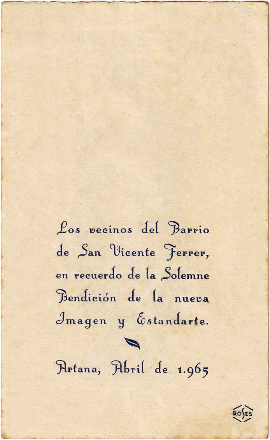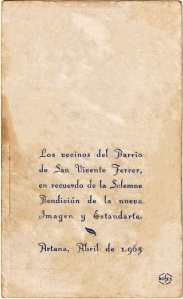 Records de la benedicció de la nova imatge de Sant Vicent Ferrer i guions del barri de Sant Vicent (?). Abril de 1965.