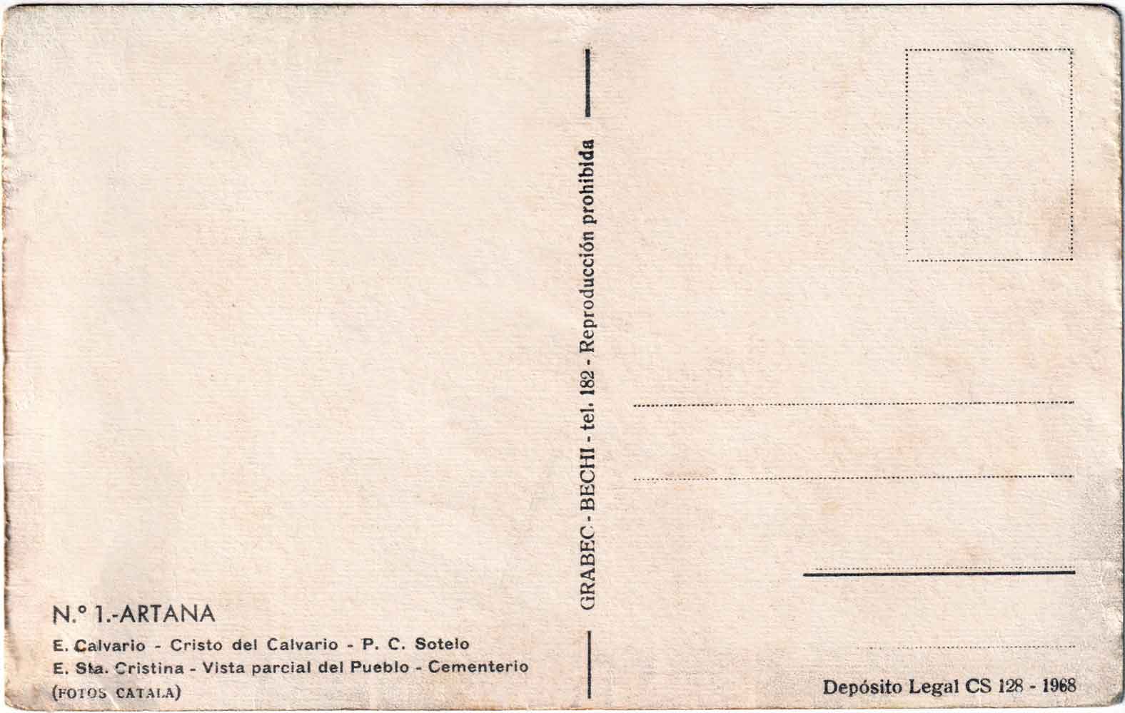 Encara que ja s’han vist en altres col·leccions, incloem dos postals de la sèrie “Motivos de Artana”, realitzades pel nostre fotògraf local, l’enyorat José Catalán (Pepe Cala), en 1968: la primera de la col·lecció, que incloïa sis imatges, i la segona, dedicada al Crist del Calvari.
