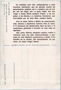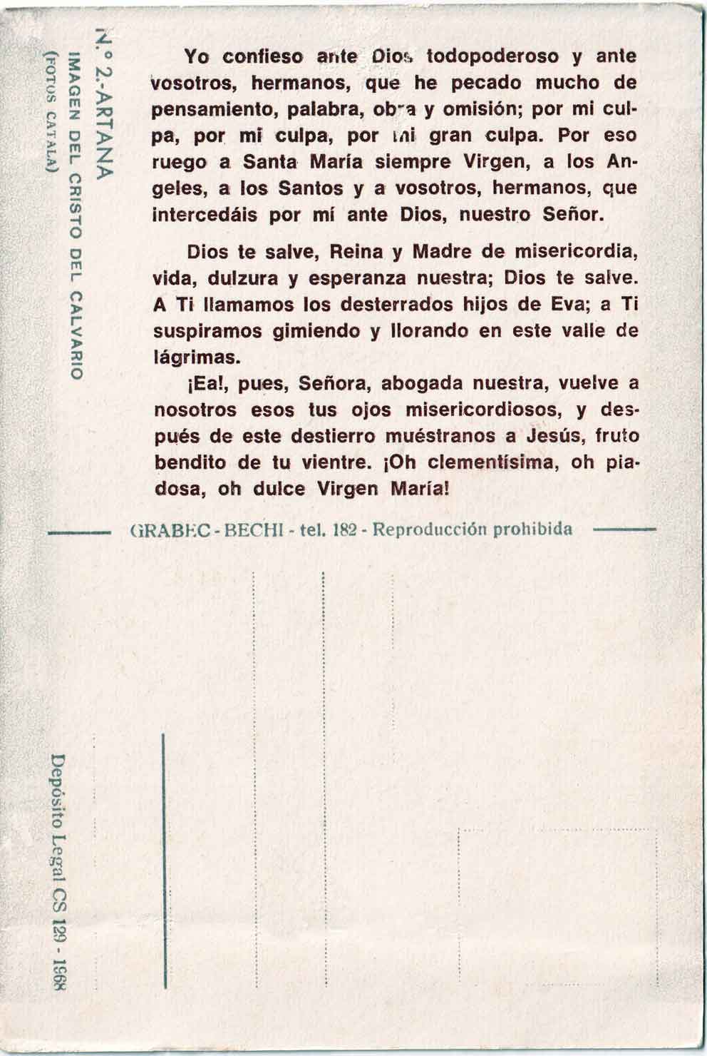 Ací s’ha imprés a més l’oració “Yo confieso” i el “Dios te salve, Reina y Madre”. La peanya és la de suro patró, que va substituir a la cremada en els primers mesos de la Guerra Civil. Hem vist més amunt que la peanya nova es va fer en 1951 (pel centenari de la festa), suposem que esta es va conservar útil per alguna raó.