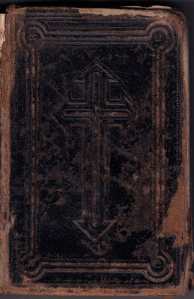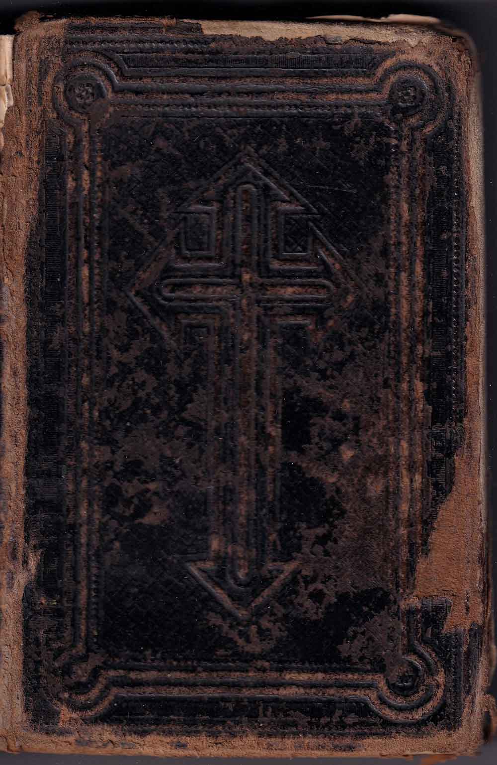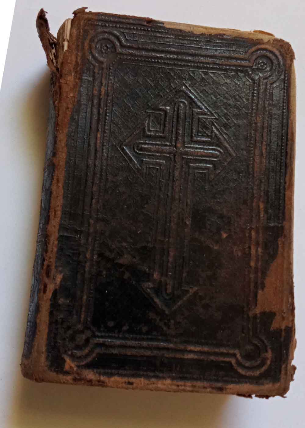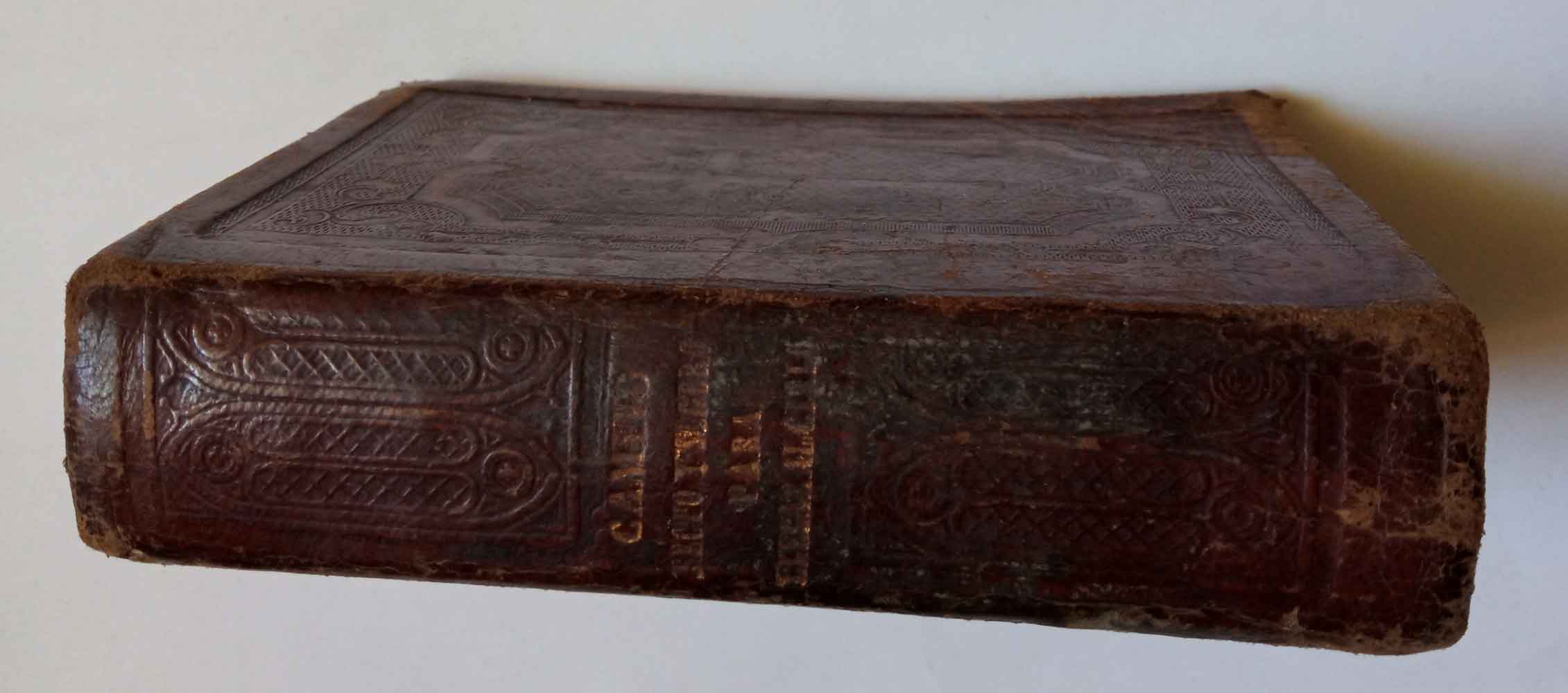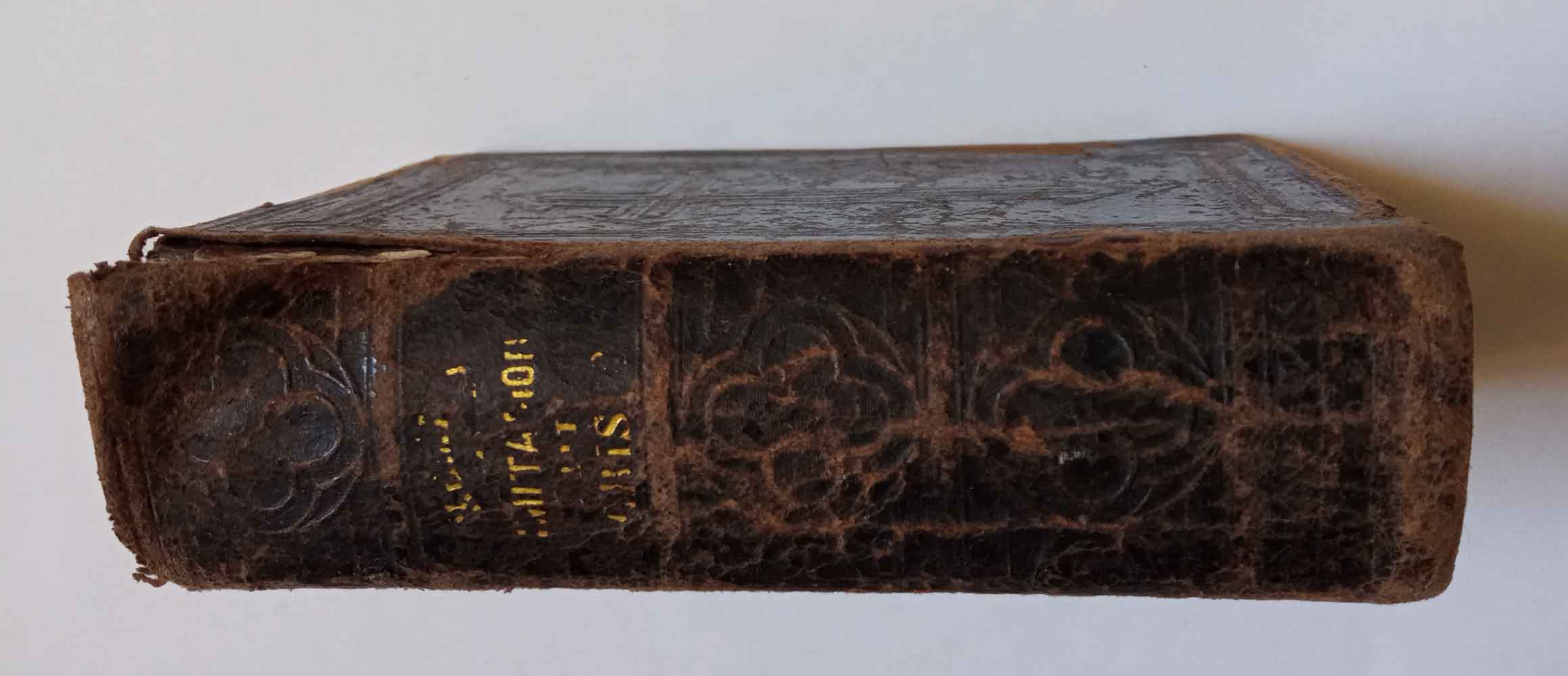 Un exemplar de Imitación de Cristo, atribuït a l’agustí alemany-neerlandés Tomàs de Kempis, autoritzat a Barcelona en 1876 (a la fi de la Tercera Guerra Carlina). Com els altres llibres que vorem, és una edició menuda (8×12’5 cm), està enquadernat en pell i té 570 pàgines de les quals falten les primeres i alguna més al final.