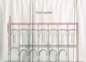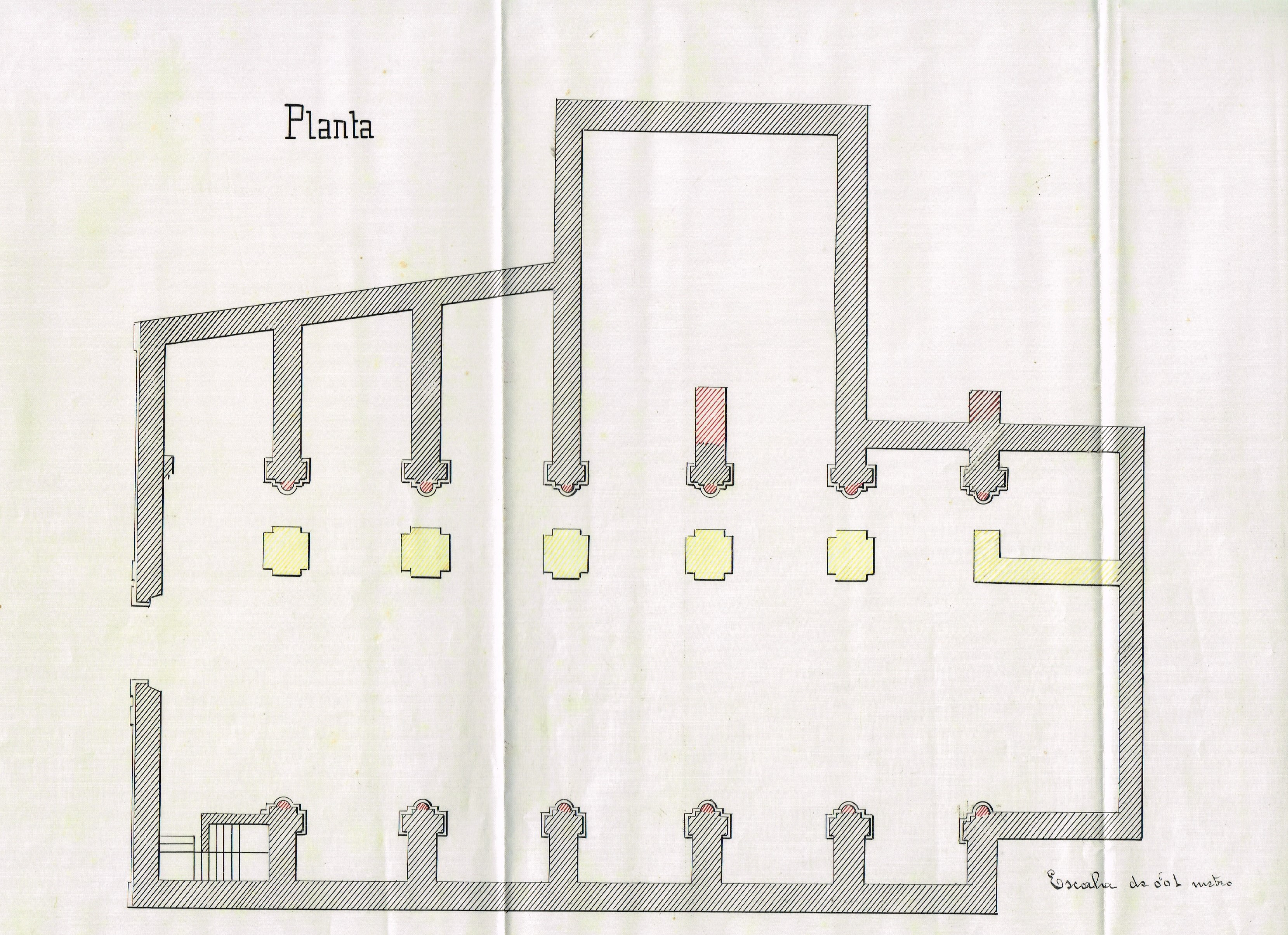 Secció transversal. En color groc es pot apreciar l’ampliació de l’església durant el segle XVIII (Mn. Emilio parla del segle XVII) amb el “claustre” —l’espai darrere dels pilars.