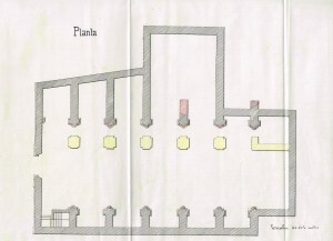 Planta de l’església a on es pot apreciar els pilars de l’ampliació, que generaven un “claustre”, i la sagristia tocant a l’altar major. L’angle inferior dret correspon a l’ampliació de l’església per l’altar major. Jordi López Vilar va trobar l’Escriptura per ampliació de la sacristia (1896).