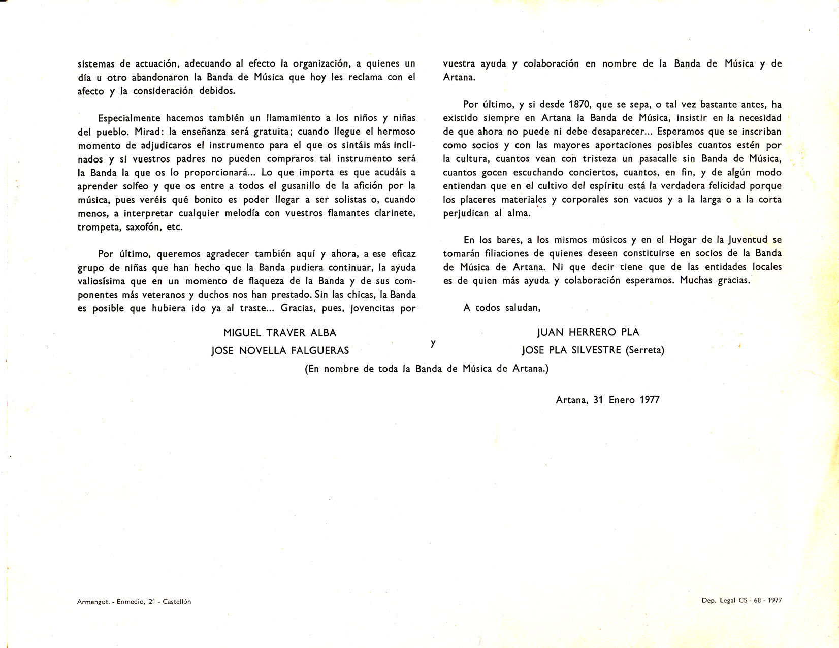 FULLET SOBRE LA BANDA DE MÚSICA. Gener de 1977