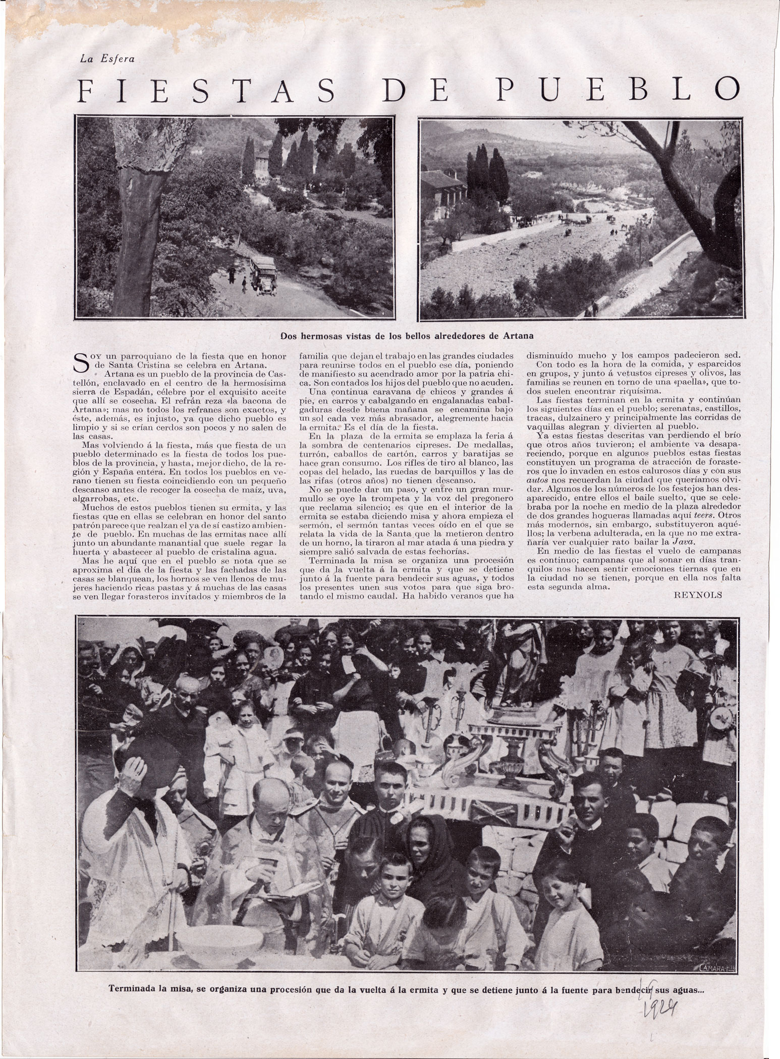 Una plana de la revista La Esfera dedicada a la festa de Santa Cristina. Pareix que és de 1924, però no tenim més informació. Està signada per un tal “Reynols”, que, donat el gust que tenia la revista per les expressions en anglés i les actituds cosmopolites, podria ser el pseudònim d’un membre qualsevol de la redacció. El to del text és urbà i modern: l’autor es queixa de l’excés de cotxes i de turisme (l’any 24!) i també de la pèrdua de les tradicions; per exemple quan diu que ja no es balla solt i que potser s’acabarà ballant la Java -que era un ball a la moda, procedent de París, entre el vals ràpid i la masurca italiana.