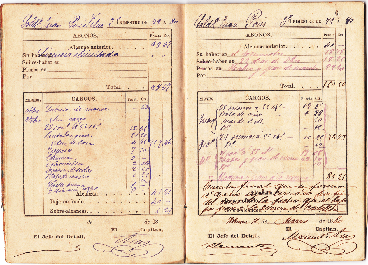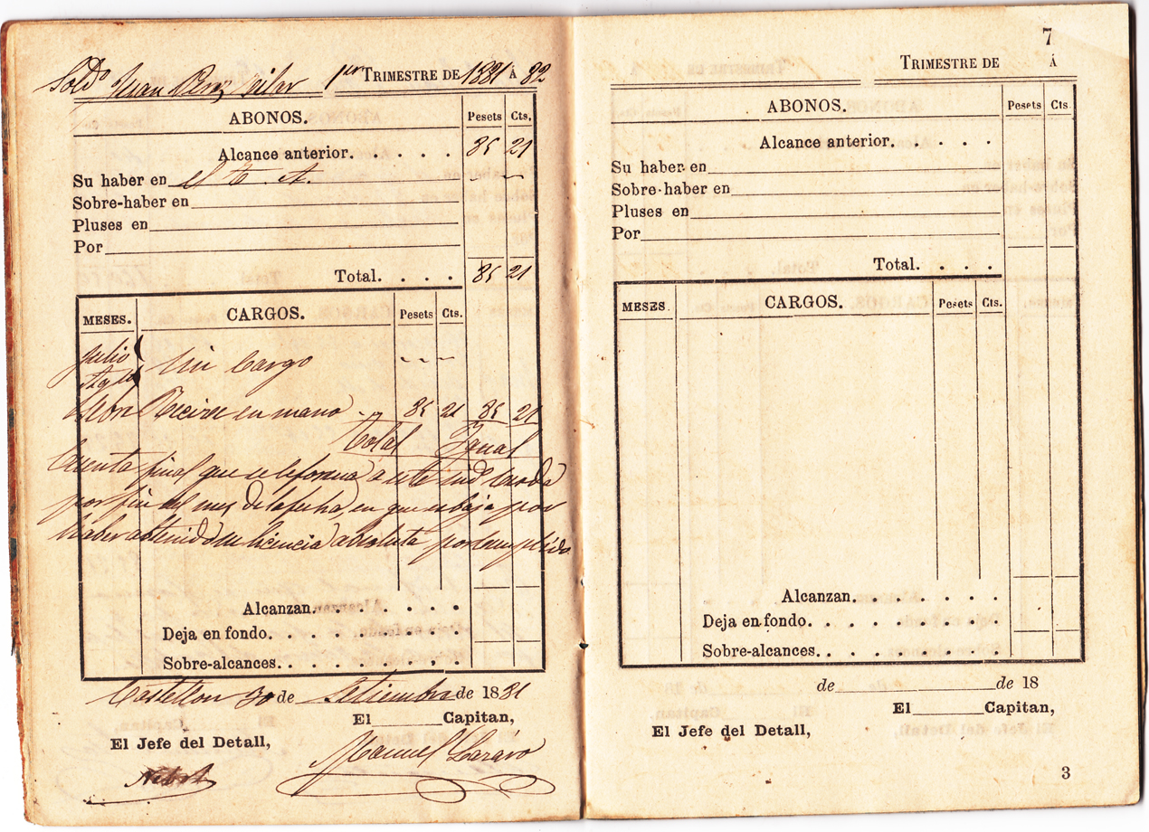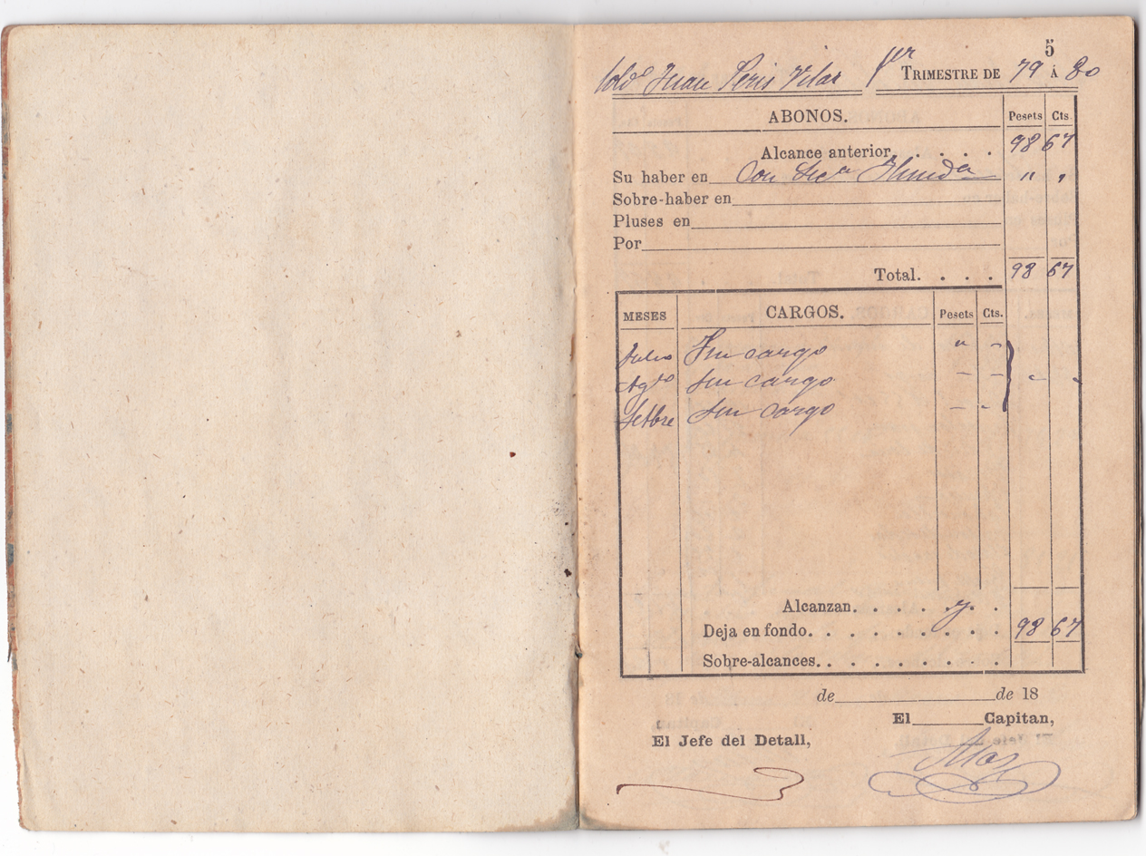 L’any 1879 la mili activa durava quatre anys (i quatre més a la reserva). Esta llibreta il·lustra les despeses d’un any, això vol dir que segurament és la segona del soldat (cada llibreta té lloc per a dotze trimestres, és a dir, tres anys). Hi havia llicències per incapacitat, per que enviudara la mare o algun altre motiu d’exempció, però ací es fa menció a que “es baja por haber obtenido su licencia absoluta por cumplida”.