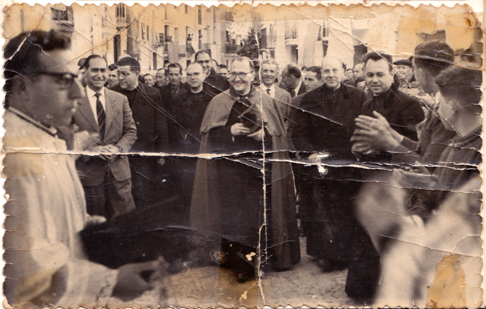 Una visita pastoral, segona meitat dels anys 50. En primer pla Mn. José Herrero, l’alcalde José Vicent ‘Caranyo’, Mn. Juan Ramón Herrero ‘Panxut’, el Sr. Bisbe Manuel Moll i Salord, Mn. José María Guinot i Mn. José Herrero ‘Panxut’. En el nacional-catolicisme els bisbes eren figures tan espirituals com polítiques. A la imatge es pot apreciar la gentada que rebia l’Autoritat, la presència de l’alcalde i tots els capellans del poble, els carrers adornats, els balcons carregats de cobertors. etc.