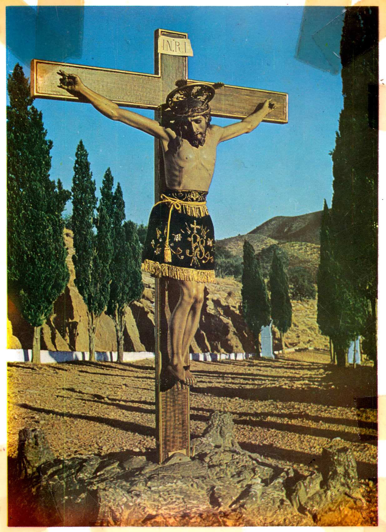 Sense eixir de la temàtica religiosa però trencant amb el blanc i negre. Es tracta d’una postal del Cristo del Calvari en la peanya antiga, de suro patró, que s’havia canviat per l’actual cap a l’any 50. Edició de Foto Catalán de 1968.