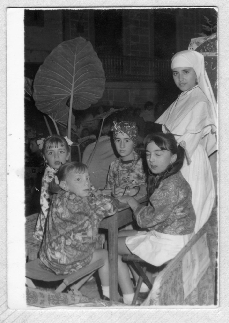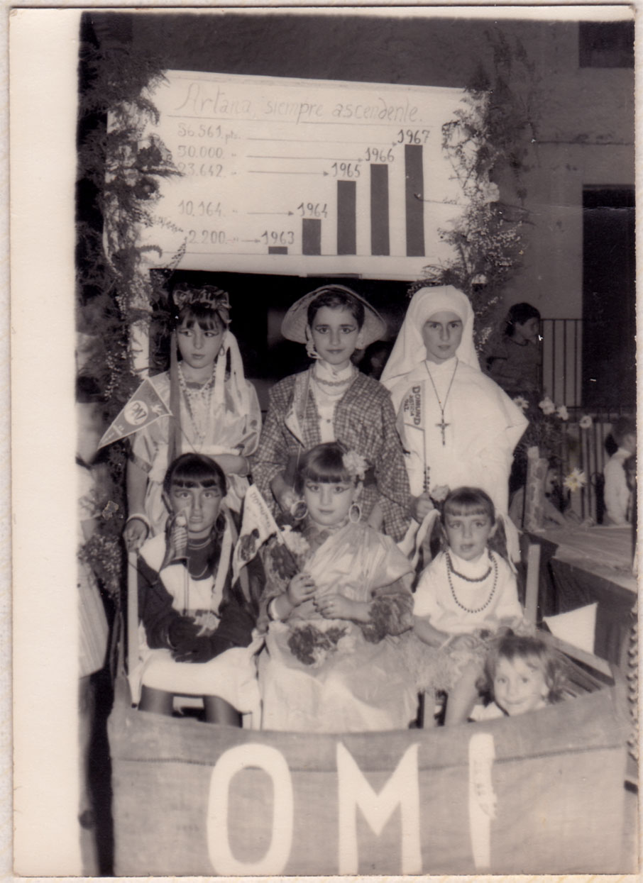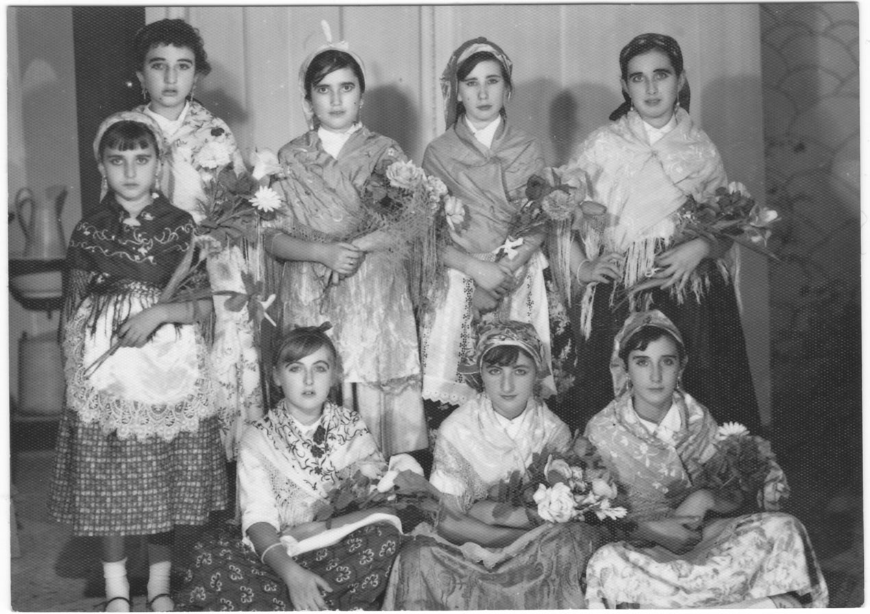 Festes religioses quasi tot l’any, i processons quasi tots els diumenges d’estiu. En este cas són xiquetes disfressades possiblement per a la cavalcada del Domund, a meitat dels anys 60. Totes les protagonistes són ben identificables: Maite Vilar, Cristina ‘Benarda’, Teresa ‘Corina’, Teresa ‘Tomasot’, Carmen ‘d’Eslida’, Lolita ‘l’Ordenari’, Pilar ‘de Màsquera’ i María Teresa ‘l’Alguatzil’.