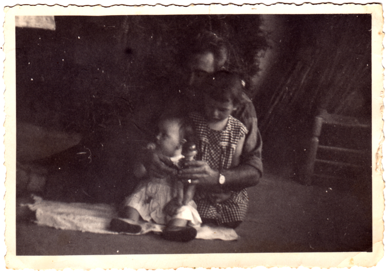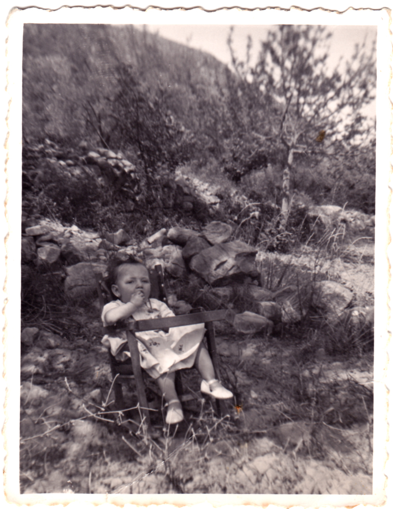 La xiqueta de bolquers és Cristineta Peris Llidó (Cristina “Benarda”, filla), asseguda en un balancí en una finca de muntanya.