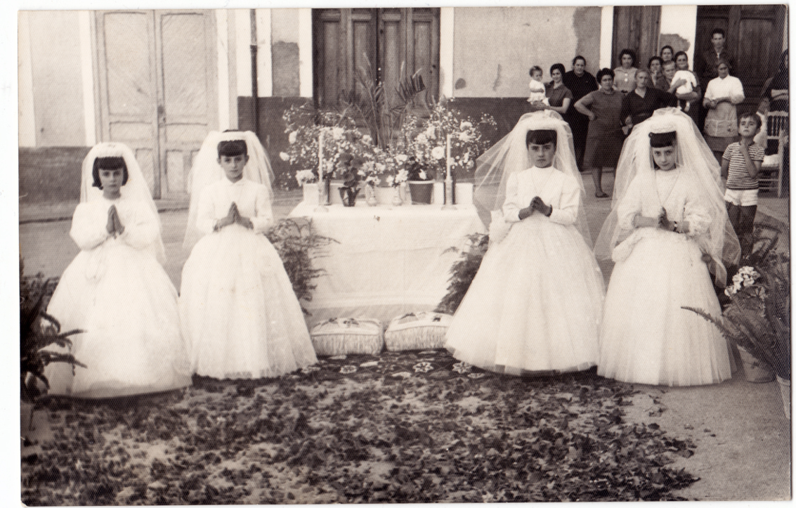Processó del Corpus de 1965. Des de l’esquerra: Lolita Peris Llidó, Maria Teresa ‘Meto’, Lolita ‘Cabota’ i Maria Teresa ‘Nela’. Entre les dones del fondo reconeixem Consolación ‘de Redona’ i Sunción ‘d’Eslida’.