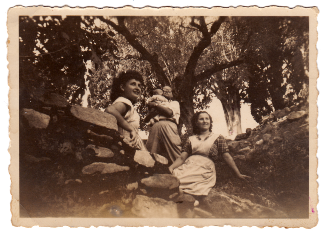 Foto Sancho, Onda. Abril de 1960. Posant a la carretera, entre bancals d’horta i amb el flamant Grup Escolar de fons, veiem Cristineta Peris Llidó, Teresa Vilar Llidó (‘Teresa Blasco’), Cristina ‘Benarda’ amb el seu fill Blai al braç i la seua germana Dolores.