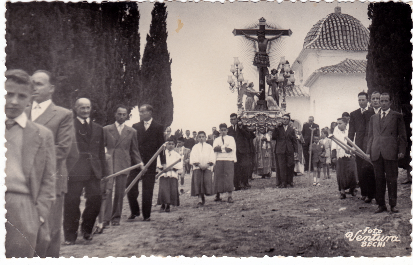 Porta una inscripció: “16-8-49. Sta. Cristina. Paella en la Ermita”. El dimarts 16 d’agost, dia de Sant Roc, una colla d’amics i amigues al voltant dels 20 anys van fer una paella a l’Ermita, tal com es pot apreciar a la foto. No resulta fàcil identificar als retratats. A la fila de darrere, la dona que porta el meló d’alger pareix ser Marí Gorra. Els homes més a la dreta són José Novella i Vicente Herrero, ‘Cafundo’. Ajupits, el més a la dreta és Juanito Peris (Juanito ‘Andreu’), i l’altra xica amb meló és Felicidad de Rufo.