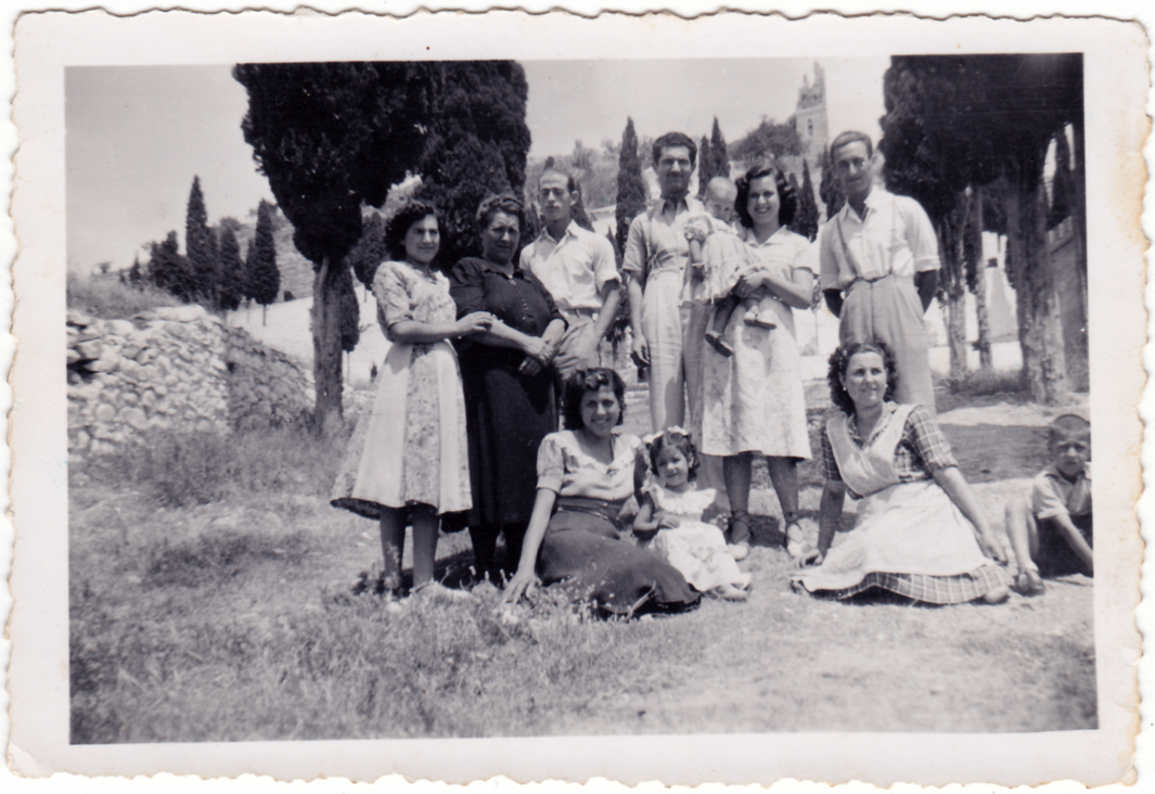 El Calvari de nou. en esta imatge estan al caminet de dalt. Drets, d’esquerra a dreta, Juan Peris, Elvira Navarro amb el seu fill José al braç, Dolores Llidó, Pascual (germà d’Elvira), Benjamín ‘de Benarda’ (germà de Dolores). Ajupits estan Vicent Garcia (Vicente “Marso”, marit d’Elvira), Cristina i Blai, i Isabel, l’altra germana d’Elvira.