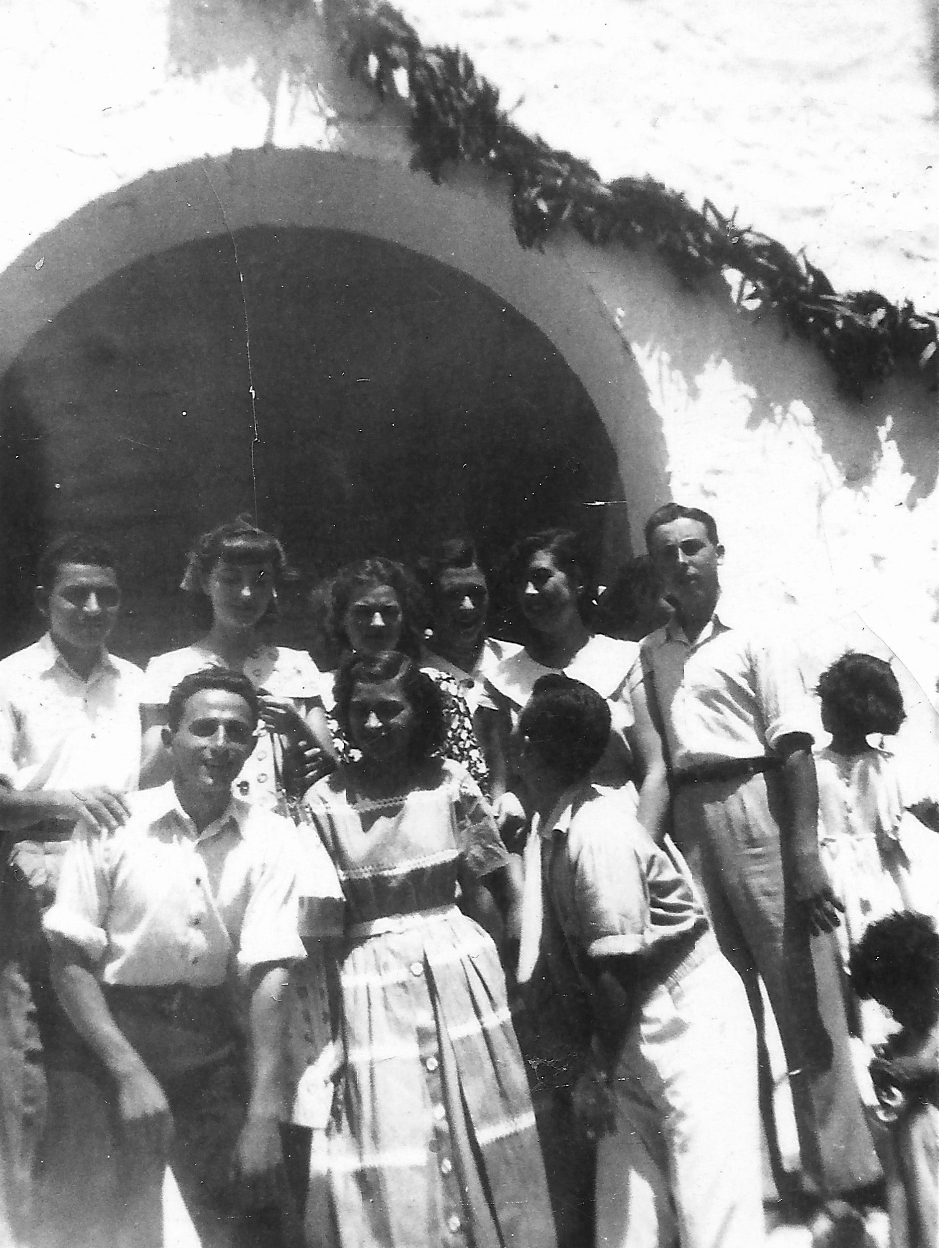 Festes de Sant Joan 1958. Les pubilles o “dames” de festes, Carmen Vilar Rosanes (esquerra) i Regina, flanquejades pel tio Panader (esquerra) i Vicent Ramon de Nela, que va carregat amb la copa per al campionat de futbol local. Pareix el carrer Baix empedrat.