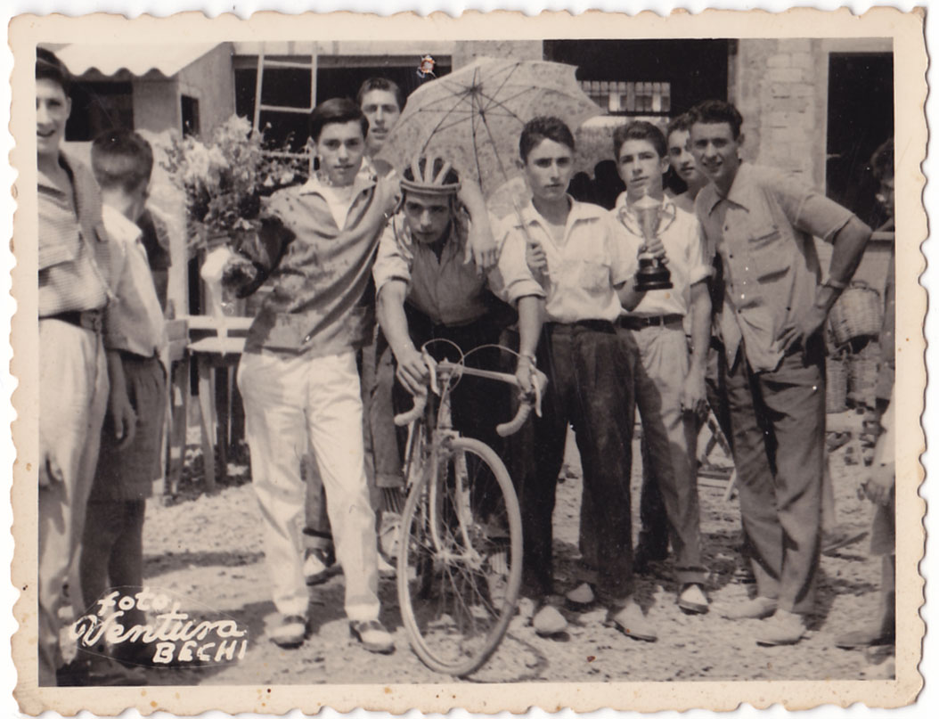 Una carrera ciclista el diumenge 30 d’agost de 1959, festes de Sant Joan. Darrere veiem obres a la carretera. Ja havia començat la urbanització. Els retratats són José Pansa i darrere pareix Juanito Pau. No hem reconegut el ciclista, però a la dreta té a Juanito Calo, Antonio el Pellero i Peret el de Vilavella.