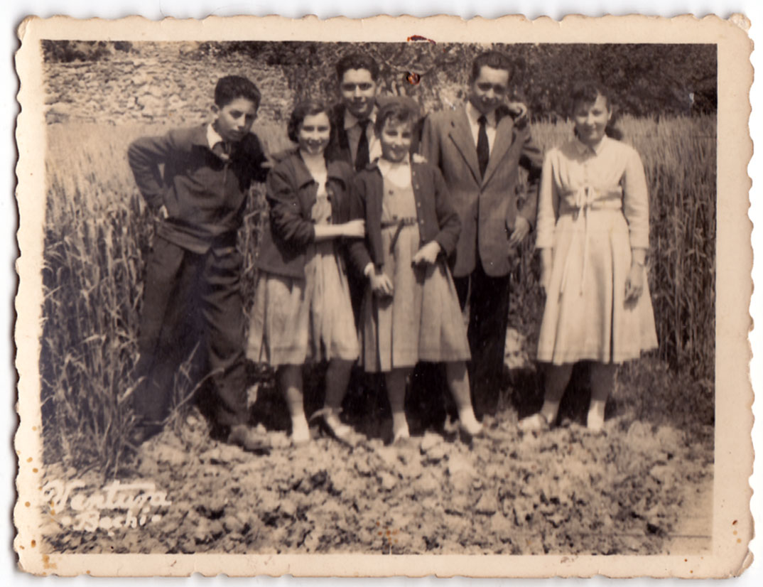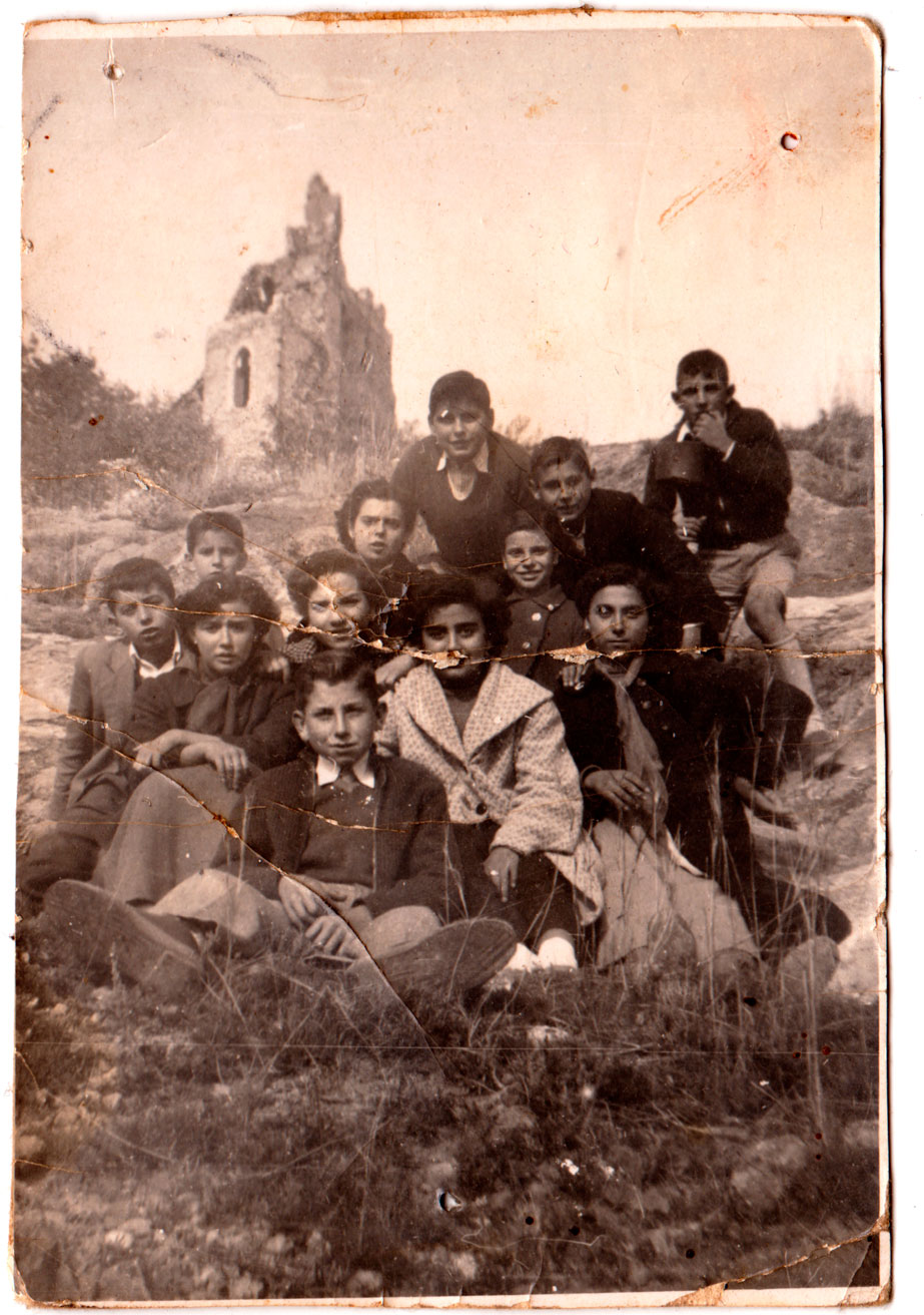 Foto del dissabte 26 d’abril de 1958. Els chiquets són Vicente Vilara, Teresa Cruz, Joaquín de Músic, Carmen de Calo, Pascual de Nano i Lolita Sabullera.