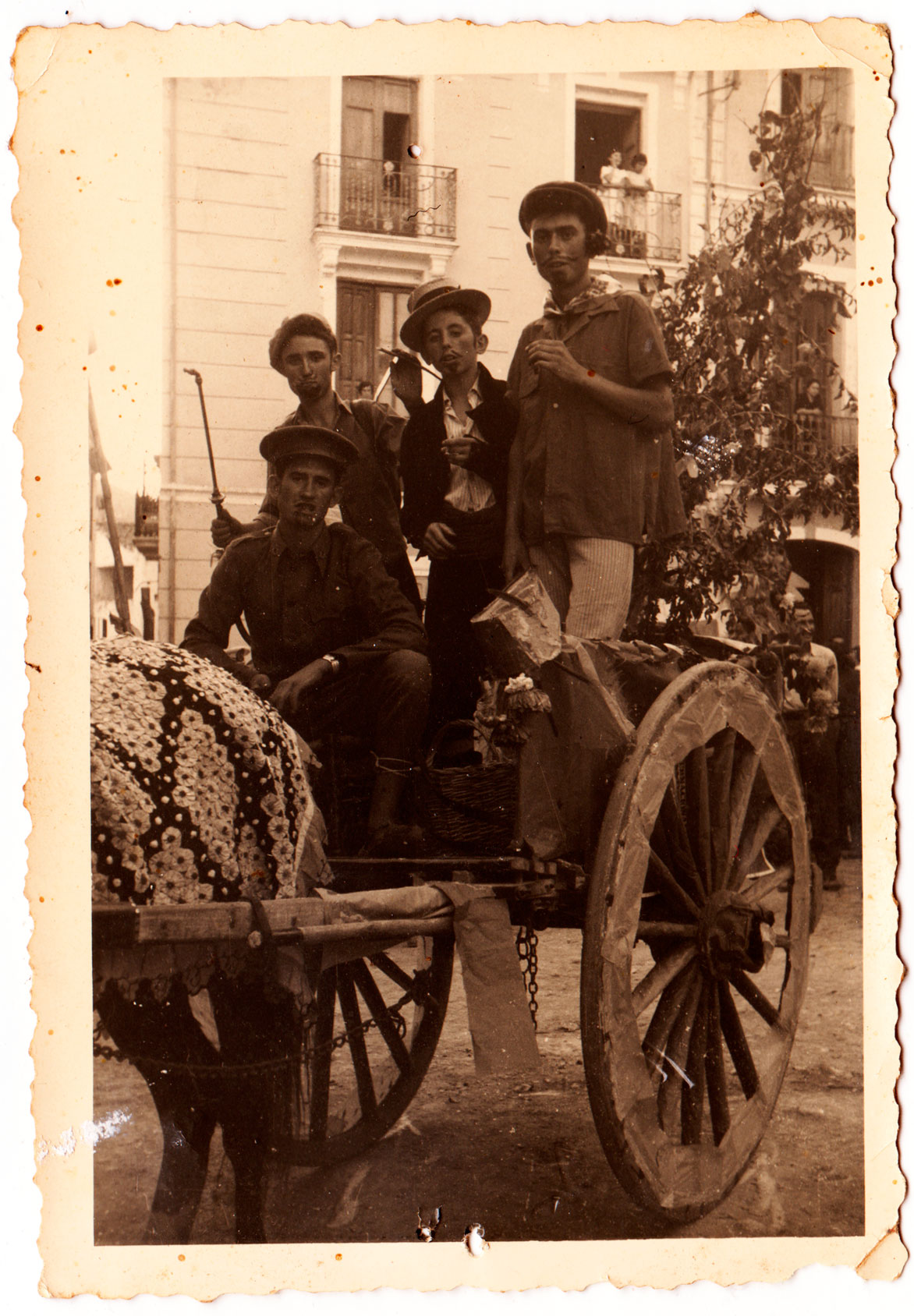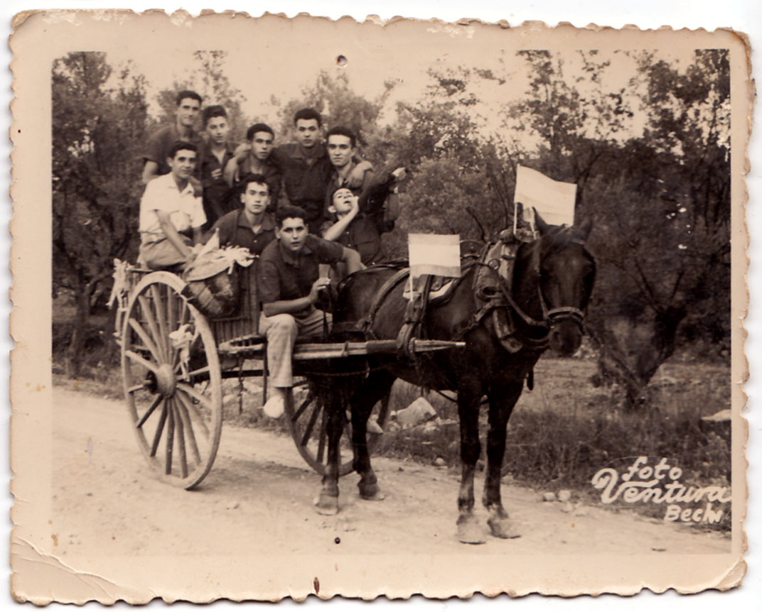 A cavall d’un carro, a migdia, amb sombreros mexicans i guitarres, possiblement anant de paella a l’Ermita. Eixen del poble pel carrer Sant Ramon. A la dreta es veu l’abeurador molt adornat, fet durant la dictadura de Primo de Rivera, que després es llevaria per posar-lo a l’altre costat de carrer (i on Roia va trencar la Reva). Els joves són, d’esquerra a dreta, Escaleta, Juanito Corina, Vicente Pla, un desconegut, i davant de tots Joaquín de Músic.