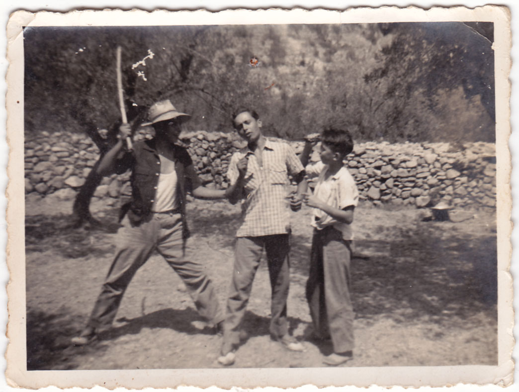 Foto datada el dijous un d’agost de 1957. Pareix que els xiquets estiguen de festa. Reconeixem, baix a la dreta, aguantant un matxet, a Bastero; dalt d’ell, a José Serreta, a l’esquerra d’este a José Rico i baix a Miguel de Panxut.