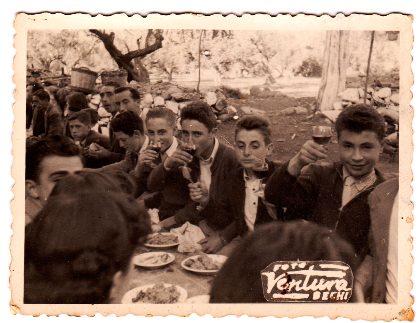 Foto del divendres un de novembre de 1957, dia de Tots Sants. Estan de paella a l’Ermita i els xiquets no se priven de brindar amb vi. De dreta a esquerra són Vicente Casota, Benjamín de Cabedo, Juanito Calo, Ángel, José Manzana i Pasqualet de Baleso.