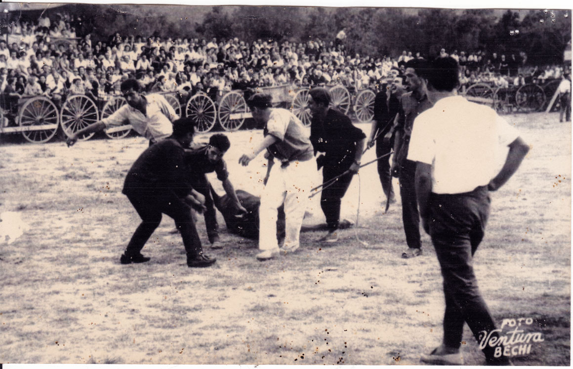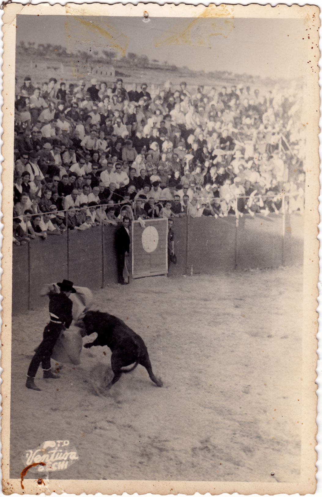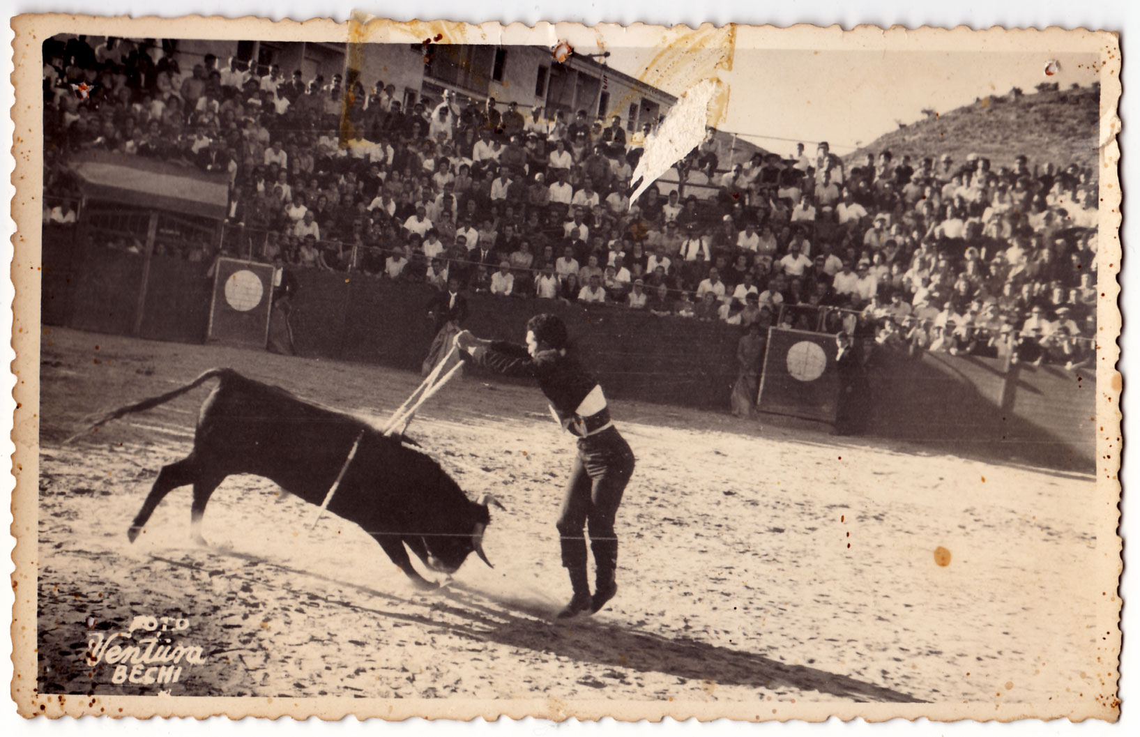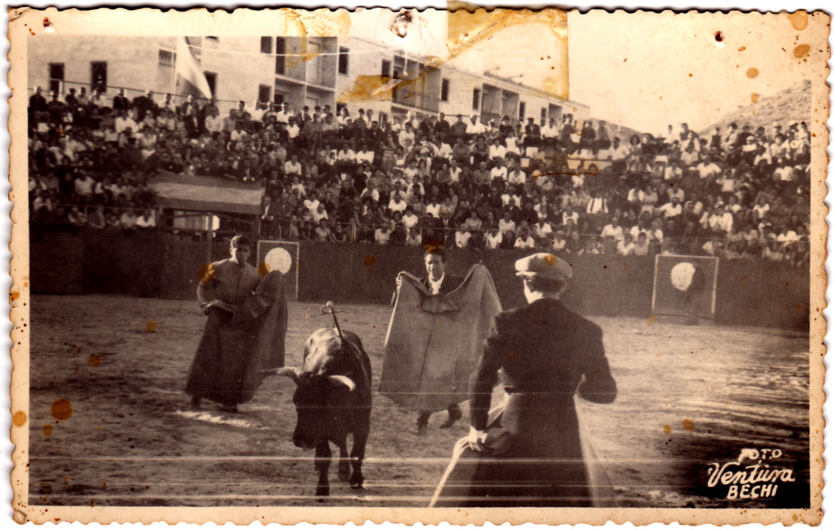 Les fotos que venen a continuació totes tenen que veure amb dos festes de bous. En esta imatge anem a l’any 58 ó 59, i a una plaça de bous que es va fer al camp de futbol amb bona part dels carros del poble. No hi havia toreros, només una xarlotada, però per la imatge deduïm que sí que va haver víctimes entre els animalets. Només reconeixem, el segon per la dreta, a Juanito l’Hort, i davant d’ell, de negre, amb tralla i boina, a Vicente Donísia.