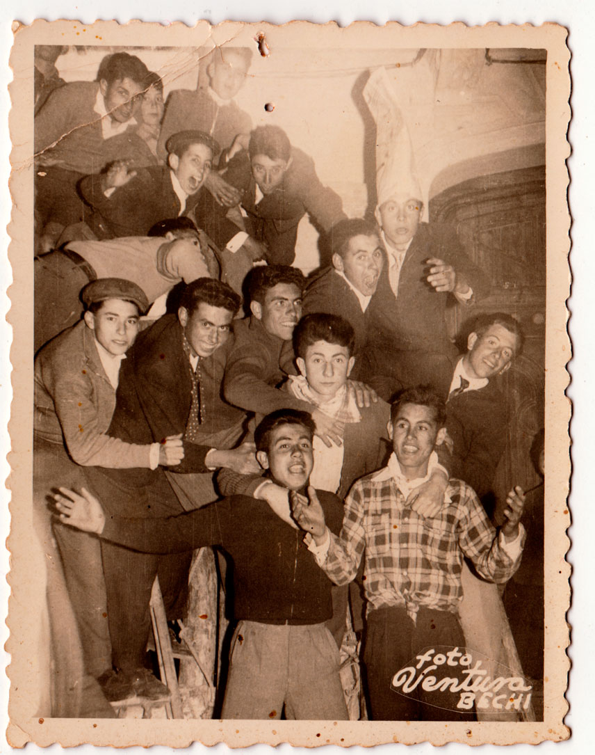 Una colla d’amics de festa. Al camionet de darrere hi ha una pianola, així que pot ser una festa de Quintos. Sobre la pianola, José Pansa, Josep Baleso, Vicente Vilara i un desconegut. Immediatament baix, Miguel de Panxut, Juanito Calo (amb gorra) i Benjamín de Cabedo. Més avall encara, Vicente Escaleta, Bastero, Pepe Solo, Cantos i Juanito Corina. Sobre la moto, Joaquín de Músic i a la vora, amb gorra, un desconegut.