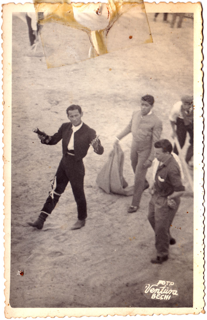 Els mateixos amb el “diestro” principal, Efraín Girón. Des de l’esquerra, Miguel l’Alguatzil, Bonet, Felip (aguaitant la careta darrera dels toreros), Francisco Roc i a la dreta del tot José Borretes. Ajupits, Eladio, Pepe Solo, Panxut i Cantos.