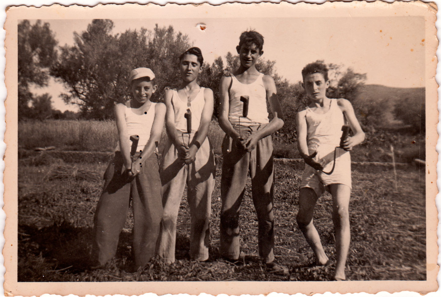 Les fotos se solen fer quan es va de festa, però de vegades també mostren a la gent treballant. En esta imatge, un grup de xiquets preadolescents que estan aterrant blat, una costum habitual a l’època. D’esquerra a dreta són Vicente Vilara, Juan José Bonet, Benjamín de Cabedo i, el més alt, Vicente Pla.