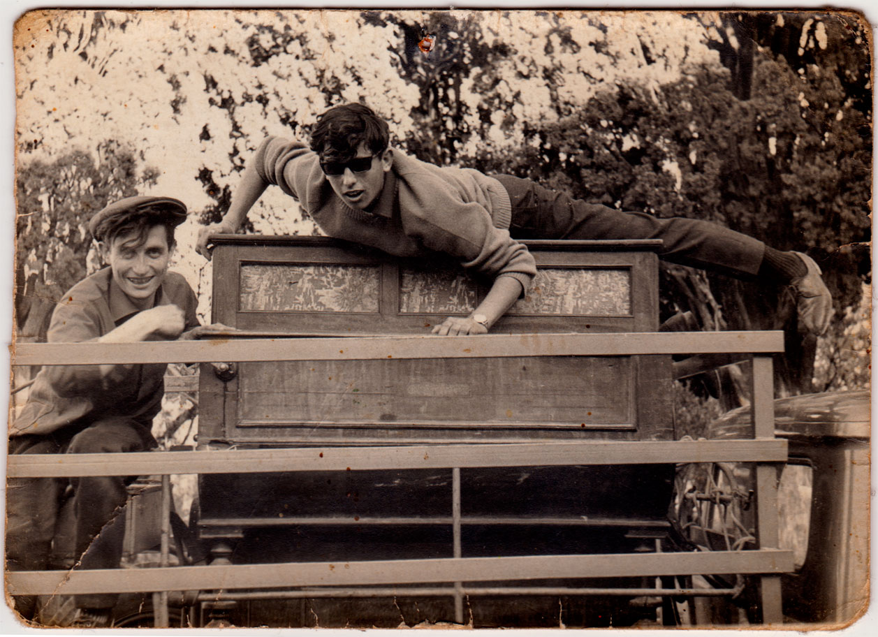 Dijous 24 de juliol de 1958, dia de Santa Cristina. Els joves tenien vehicle propi. D’esquerra a dreta són, amb camisa blanca, Benjamín de Cabedo, darrere Vicente Pla, dos desconeguts, Pepe Solo, Pepe Cala i un desconegut que beu en una bota espectacular. Davant estan Bastero i Ximo Músic.