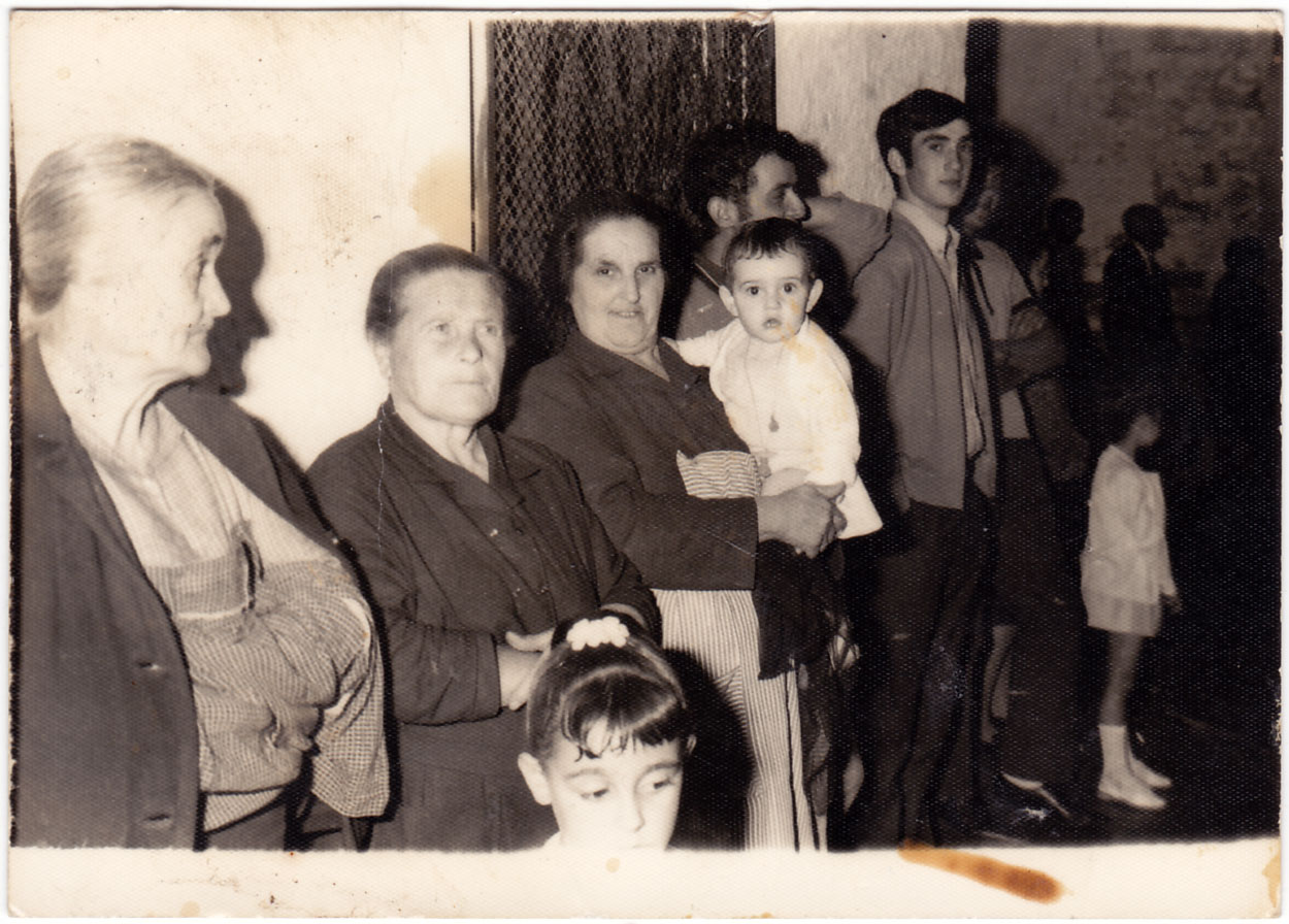 Dones i xiquets observant el pas d’alguna processó. D’esquerra a dreta, la Señora Monsalud, la tia Doloretes de Perales, Marí Rulla i potser els dos nets. El jove de la punta pareix Joaquín d’Olegario.