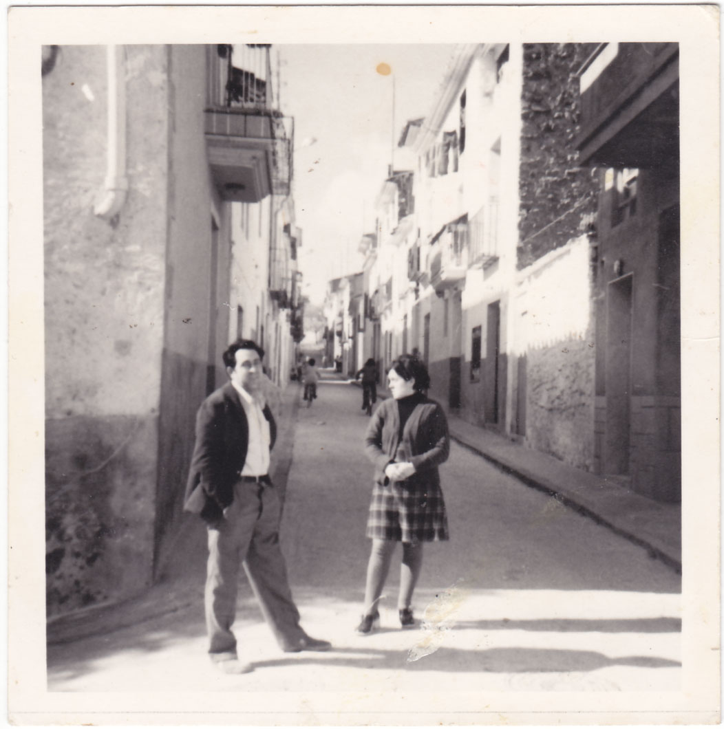Ja estem als anys 60. Una preciosa foto de dos generacions de la família, als caminets del Calvari. Tècnicament i artísticament virtuosa. D’esquerra a dreta, Rosarito Rulla; la seua germana major, Marí Rulla i el que seria el seu marit, Vicente ‘Donisia’; a continuació els pares d’este, Teresa María ‘Donísia’ i Vicente ‘de Florencio’. El de la punta de la dreta és Juanito ‘Donisia’.