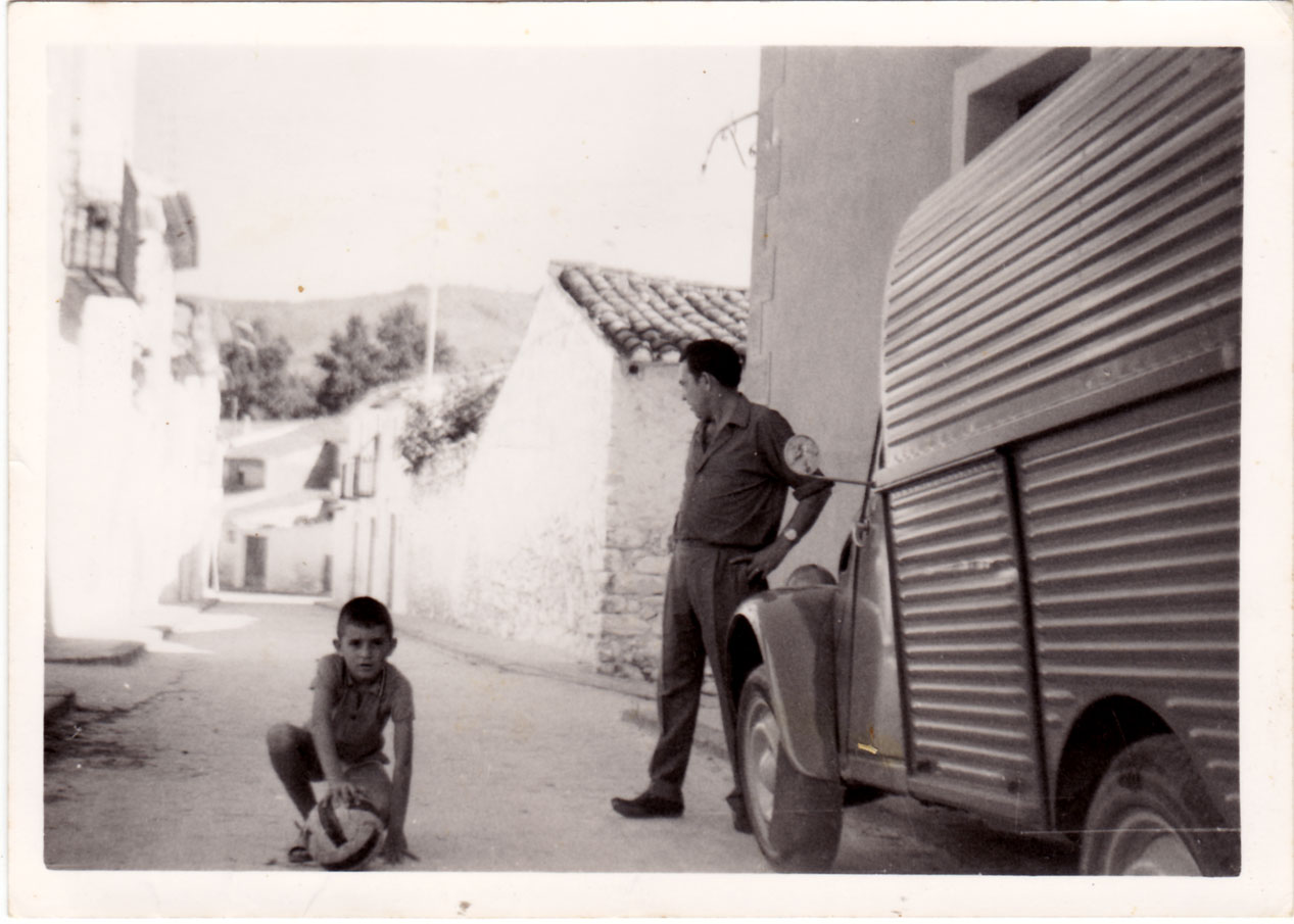 - Una simpàtica imatge amb un xiquet de bolquers. El de l’esquera és Juanito Donísia, i el de la dreta pareix Juanito Rochera. S’aprecia molt bé el dibuix de l’empedrat de la plaça, en aquell moment molt desgastat. Està datada per darrere: 15FEB1959.