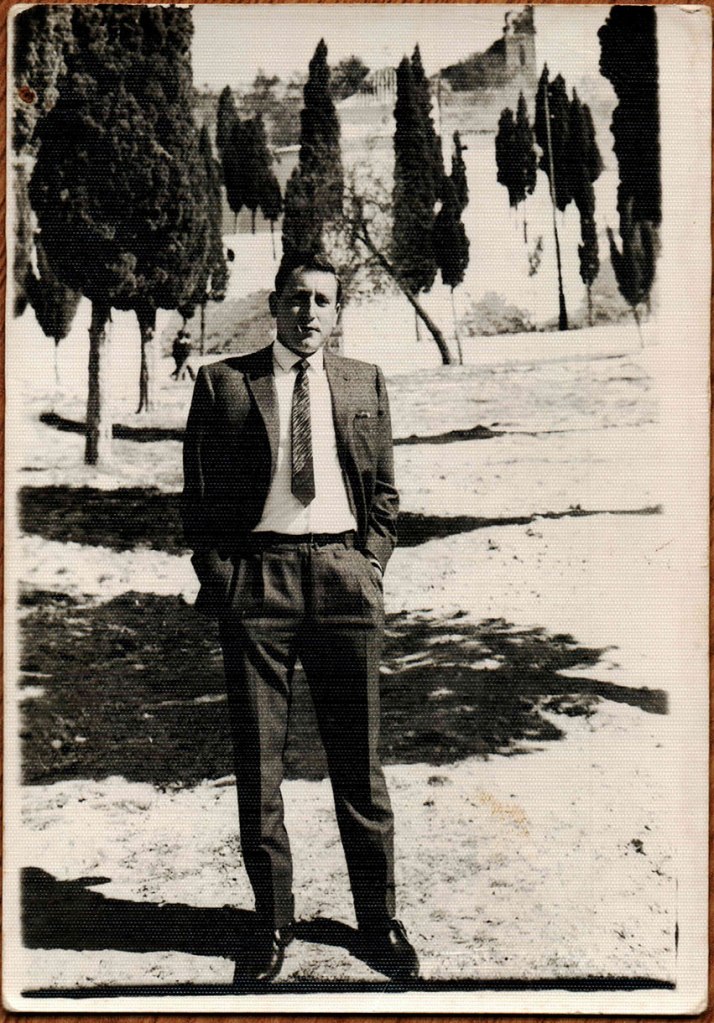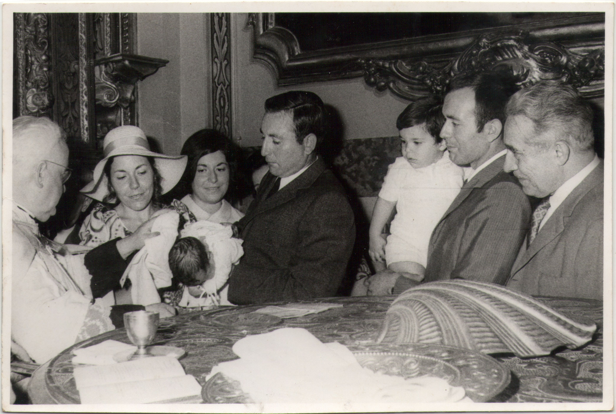 13. Alonso, padrí d’un nebot, fill del seu germà Juan, en el bateig a València. D’esquerra a dreta el capellà, la germana de la cunyada, la cunyada, ell, Juan amb un fill al braç i el seu sogre. Foto Calpena, València. Dilluns 29 de juny de 1970.