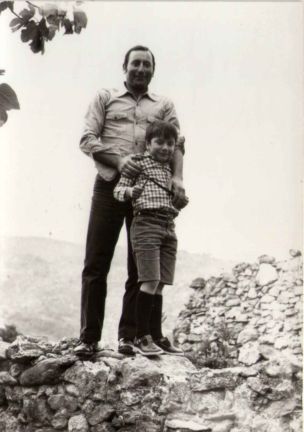14. Alonso i un xiquet amb una fona (potser el seu fillol), posen en un lloc elevat, pareix algun tipus de construcció de morter, podria ser el Castell. Van mudats, amb bones sabates.