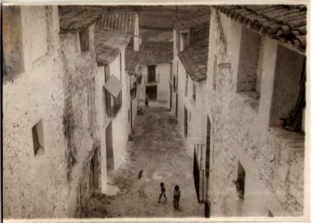 15. El carrer Peral des de ca Alonso. Possiblement és una fotografia de Juan, que disposava de càmera i tenia afició a retratar-ho tot. El canvi en el poble és espectacular: algunes cases es veuen amb les portes molt precàries, els carrers són de terra i l’horta es veu completament en producció. Pareix que ja estan instal·lades les clavegueres, seria a finals dels anys 60 o principi dels 70.
