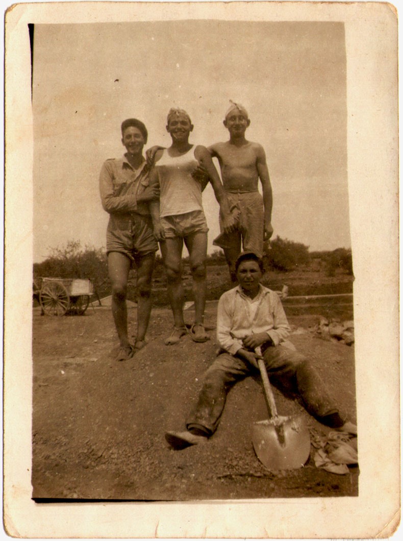 16. Una foto molt bonica de treballadors a la Muntanyeta Sant Antoni, pareix que fent una finca. Són uns joveníssims Alonso, Carlitos amb bona pitera, Antonio Juana i davant Miguel de Panchut, assegut sobre el muntó de grava amb la pala. El carro encara du les rodes de ferro. Aquella era una època de transformació accelerada del secà en regadiu, amb unes plantacions de tarongers de preu en augment.