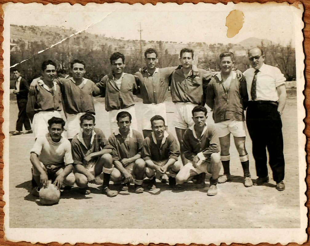 17. Durant uns mesos Alonso va treballar a la mina. Conta que cavant hort guanyaven 60 pessetes i que a la mina ja eren més de vint duros. Primer va treballar fora però a la llarga es va fer l’ànim i va entrar a picar dins. Conta tot el frau que es feia, posant terra als camions en compte de material de ferro (ho conta Josep Herrero Cabanyes en el text sobre La mina de la Font del Ferro). Sobre esta imatge, diu que a la mina van organitzar dos equips de futbol entre els treballadors; este és un d’ells. D’Artana reconeixem a Vicente Donísia, el primer de darrere per l’esquerra; a Enrique Baül, el que fa quatre; i a Alonso al seu costat. Ajupits veiem, al mig, a Tarsán; els dos xics de la dreta van viure a Artana durant algun temps, el de la punta era gallec i pareix que va arribar a festejar ací. La resta viurien a la Vall d’Uixó.