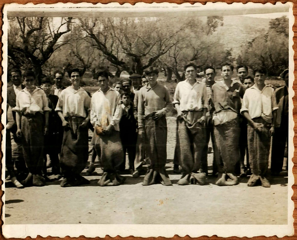 18. Per Santa Bàrbara, patrona dels miners (4 de desembre), des de la mina van organitzar un dia de jocs a l’Ermita: van plantar, per exemple, un cabiró ben ensabonat i havien d’aconseguir algun premi. Diu que estava tan ben ensabonat que no va aconseguir baixar-lo ningú. Esta és la imatge d’una carrera de sacs, hi ha set contendents amb els peus lligats dins de sacs fins a la cintura. Foto de “Martín Pérez Pérez – Acordeonista – Mascarell – Nules”.