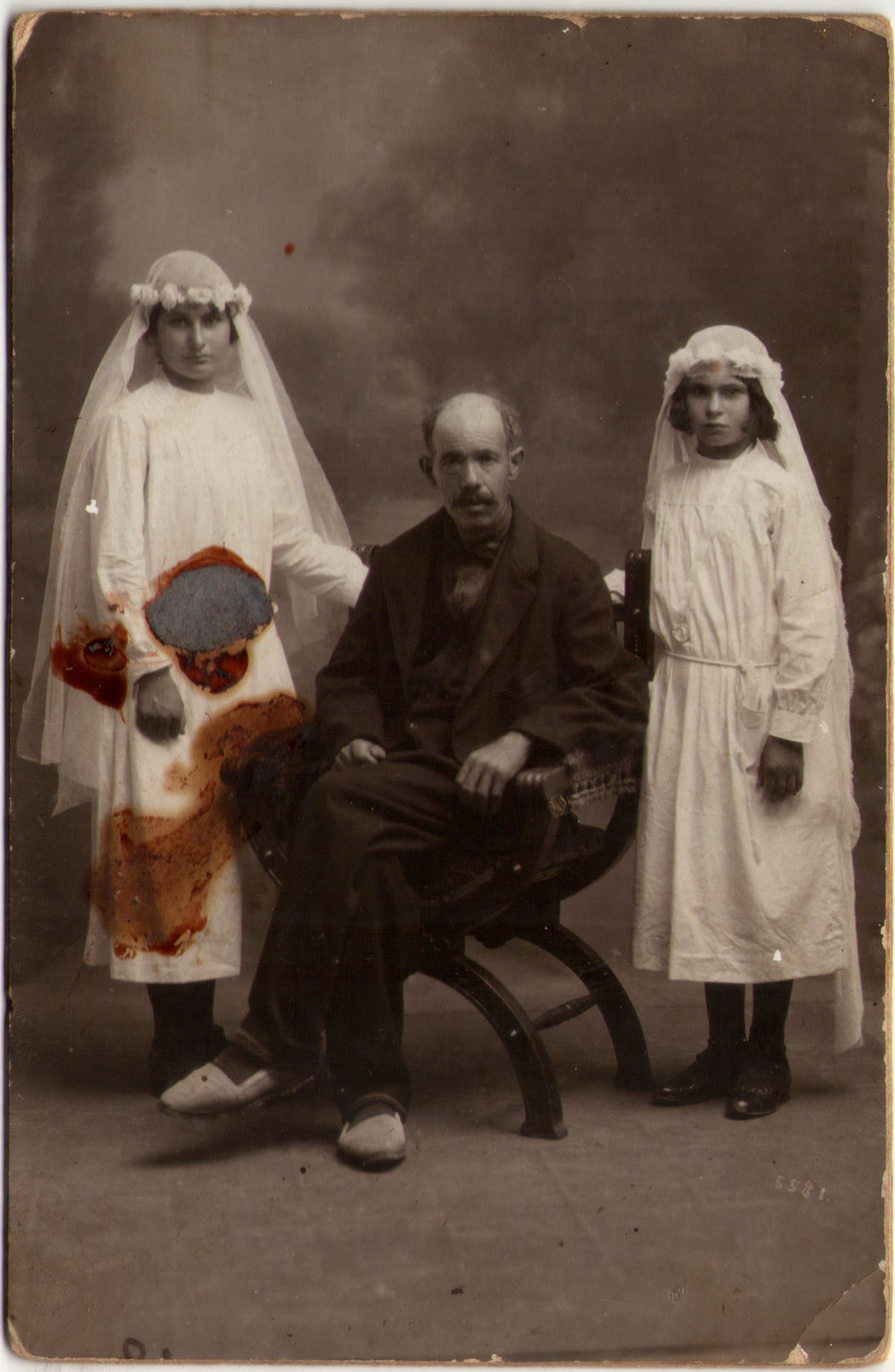 1. Una foto preciosa del temps del modernisme fotogràfic. Suposem que serà un pare amb dos filles en el primer quart del segle XX; no hem trobat ningú que els reconega, però donat que estaven a ca Alonso segurament seran avantpassats. Ell està assegut en un elegant sillonet de l’època, darrere tenen un teló que representa un paisatge o jardí. Les xiquetes van vestides de comunió, de blanc immaculat, amb la cintura molt baixa i un vel subjecte amb una corona de floretes. Els vestits són molt senzills, quasi diríem que austers, rectes, sense entallar. Porten calces i sabates negres. Tot i el luxe de la posada en escena, no deixa de parèixer un grup de gent modesta, segurament una família treballadora.